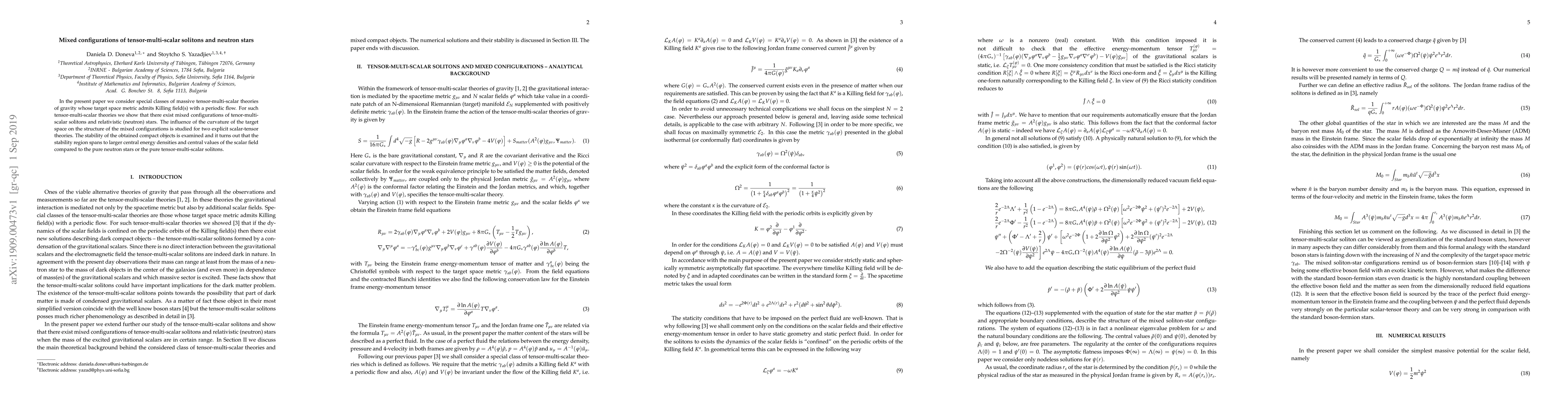 In the present paper we consider special classes of massive tensor-multi-scalar theories of gravity whose target space metric admits Killing field(s) with a periodic flow. For such tensor-multi-scalar theories we show that there exist mixed configurations of tenor-multi-scalar solitons and relativistic (neutron) stars. The influence of the curvature of the target space on the structure of the mixed configurations is studied for two explicit scalar-tensor theories. The stability of the obtained compact objects is examined and it turns out that the stability region spans to larger central energy densities and central values of the scalar field compared to the pure neutron stars or the pure tensor-multi-scalar solitons.