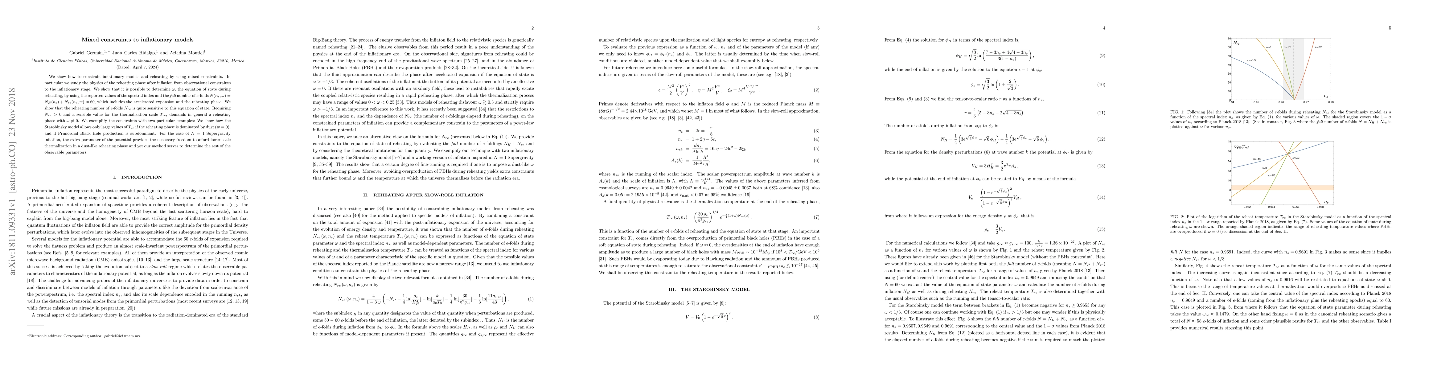 We show how to constrain inflationary models and reheating by using mixed constraints. In particular we study the physics of the reheating phase after inflation from observational constraints to the inflationary stage. We show that it is possible to determine $\omega$, the equation of state during reheating, by using the reported values of the spectral index and the {\it full} number of $e$-folds $N(n_s,\omega)= N_H(n_s)+N_{re}(n_s,w)\approx 60$, which includes the accelerated expansion and the reheating phase. We show that the reheating number of $e$-folds $N_{re}$ is quite sensitive to this equation of state. Requiring $N_{re}>0$ and a sensible value for the thermalization scale $T_{re}$, demands in general a reheating phase with $\omega\neq 0$. We exemplify the constraints with two particular examples: We show how the Starobinsky model allows only large values of $T_{re}$ if the reheating phase is dominated by dust ($w =0$), and if Primordial Black Hole production is subdominant. For the case of $N=1$ Supergravity inflation, the extra parameter of the potential provides the necessary freedom to afford lower-scale thermalization in a dust-like reheating phase and yet our method serves to determine the rest of the observable parameters.
