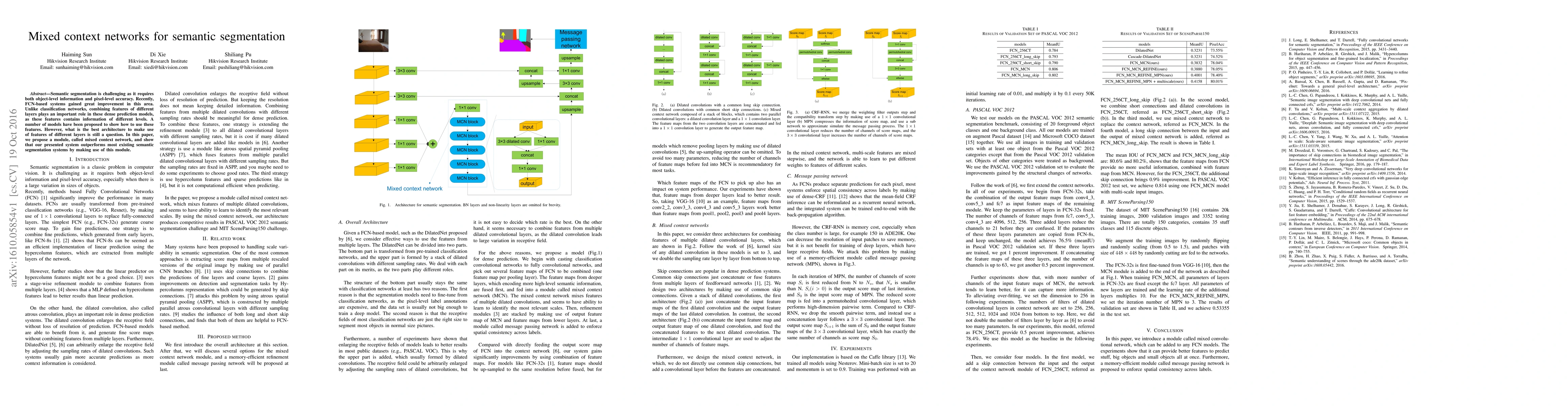 Semantic segmentation is challenging as it requires both object-level information and pixel-level accuracy. Recently, FCN-based systems gained great improvement in this area. Unlike classification networks, combining features of different layers plays an important role in these dense prediction models, as these features contains information of different levels. A number of models have been proposed to show how to use these features. However, what is the best architecture to make use of features of different layers is still a question. In this paper, we propose a module, called mixed context network, and show that our presented system outperforms most existing semantic segmentation systems by making use of this module.