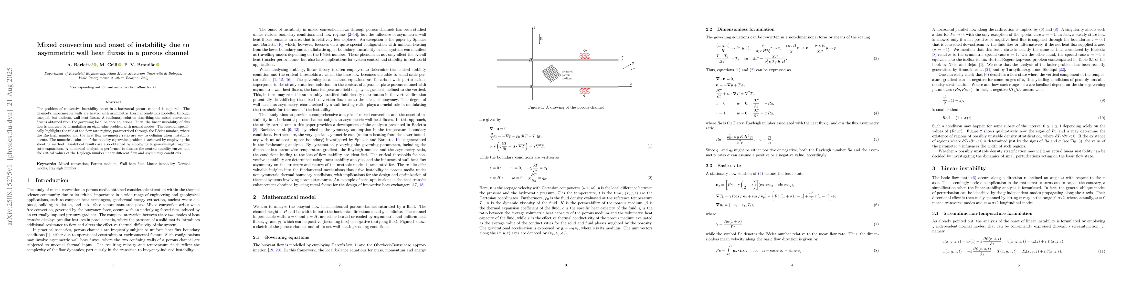 The problem of convective instability onset in a horizontal porous channel is explored. The channel's impermeable walls are heated with asymmetric thermal conditions modelled through unequal, but uniform, wall heat fluxes. A stationary solution describing the mixed convection flow is obtained from the governing local balance equations. Then, the linear instability of this flow is analysed by formulating an eigenvalue problem with normal modes. The research specifically highlights the role of the flow rate regime, parametrised through the P\'eclet number, where the Rayleigh number and the heat flux asymmetry ratio are key to defining when instability occurs. The numerical solution of the stability eigenvalue problem is achieved by employing the shooting method. Analytical results are also obtained by employing large-wavelength asymptotic expansions. A numerical analysis is performed to discuss the neutral stability curves and the critical values of the Rayleigh number under different flow and asymmetry conditions.