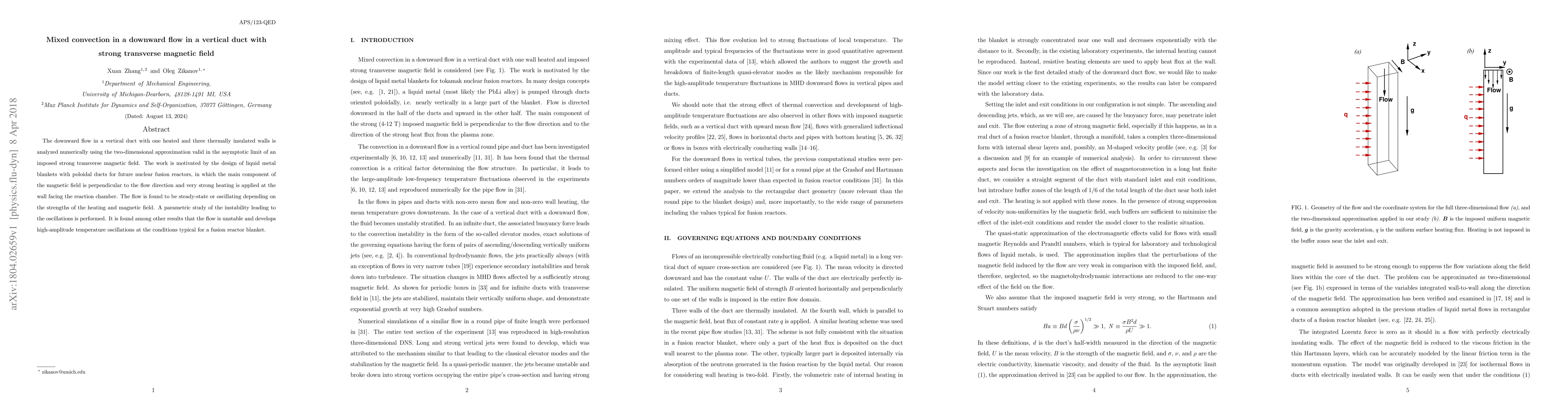 This paper numerically investigates mixed convection in a vertical duct with strong transverse magnetic fields, focusing on a downward flow configuration with one heated wall. The study reveals that the flow can be steady-state or oscillate, depending on heating and magnetic field strengths, and identifies conditions leading to high-amplitude temperature oscillations typical for fusion reactor blankets.