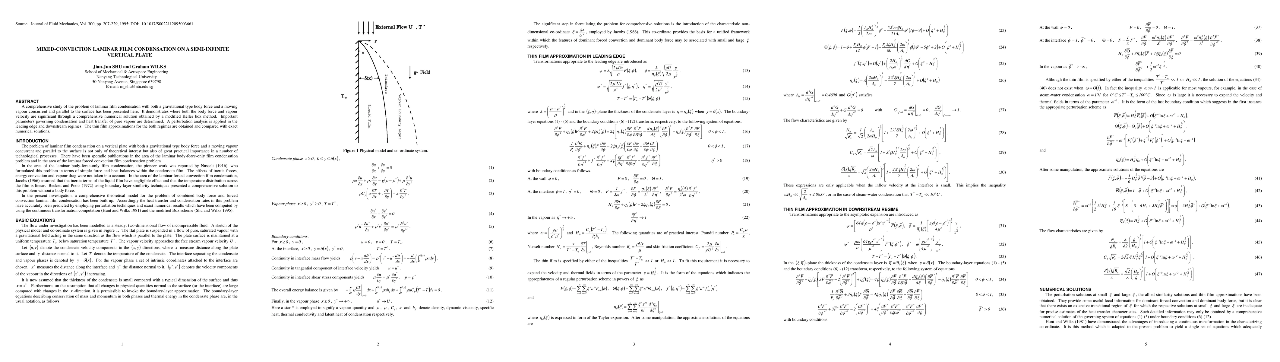 This paper investigates laminar film condensation on a vertical plate under mixed-convection conditions using a modified Keller box method. It determines key parameters for condensation and heat transfer, applying perturbation analysis and comparing thin film approximations with exact numerical solutions.