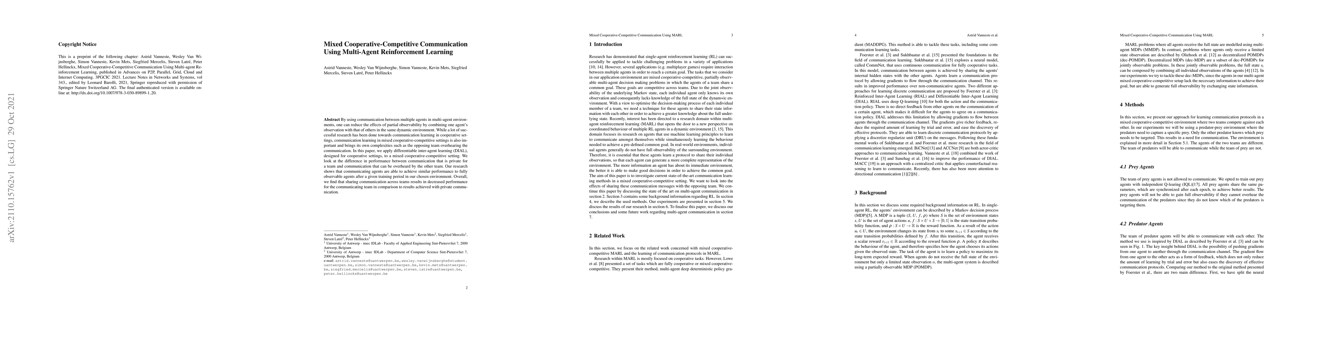 By using communication between multiple agents in multi-agent environments, one can reduce the effects of partial observability by combining one agent's observation with that of others in the same dynamic environment. While a lot of successful research has been done towards communication learning in cooperative settings, communication learning in mixed cooperative-competitive settings is also important and brings its own complexities such as the opposing team overhearing the communication. In this paper, we apply differentiable inter-agent learning (DIAL), designed for cooperative settings, to a mixed cooperative-competitive setting. We look at the difference in performance between communication that is private for a team and communication that can be overheard by the other team. Our research shows that communicating agents are able to achieve similar performance to fully observable agents after a given training period in our chosen environment. Overall, we find that sharing communication across teams results in decreased performance for the communicating team in comparison to results achieved with private communication.