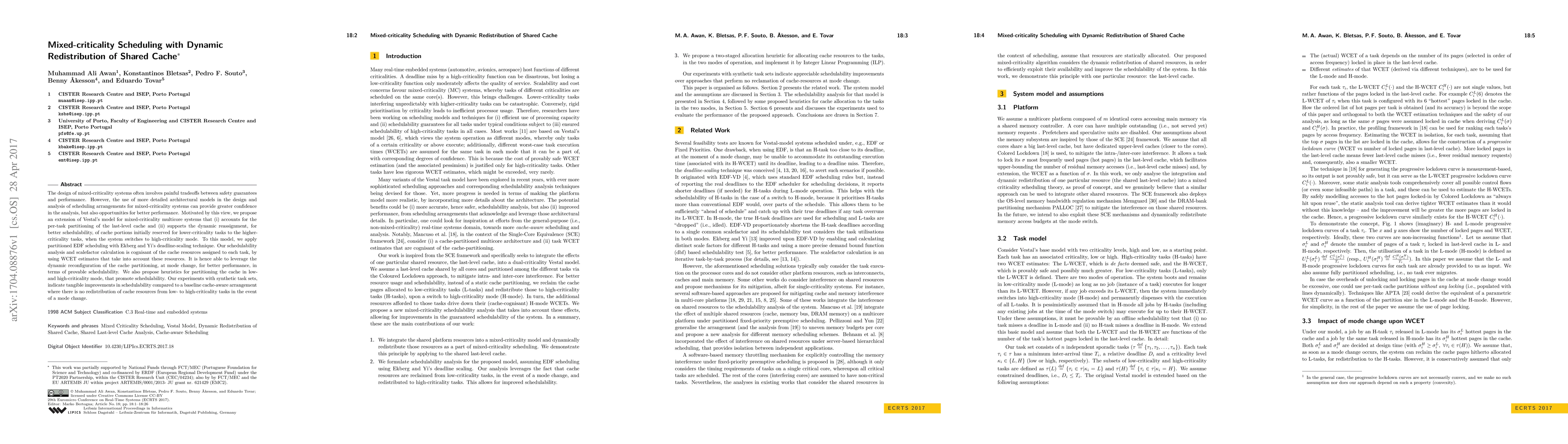 This paper proposes an extended model for mixed-criticality multicore systems that dynamically redistributes shared cache resources to enhance performance while maintaining schedulability. The model leverages partitioned EDF scheduling and cache partitioning heuristics to improve schedulability, demonstrating better performance through experiments with synthetic task sets.
