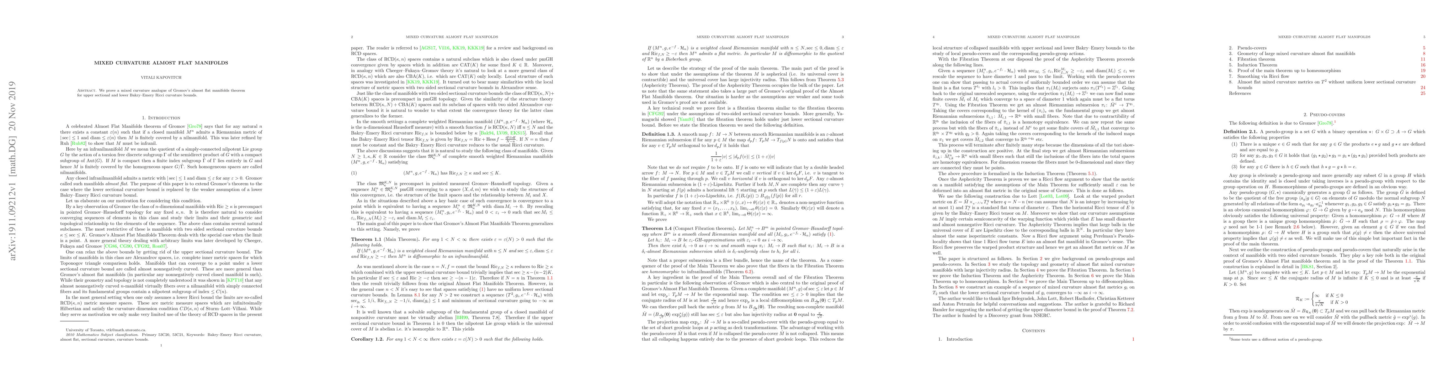 Summary: This paper establishes a mixed curvature analogue of Gromov's almost flat theorem, demonstrating the structural properties of manifolds with both upper sectional and lower Bakry-Emery Ricci curvature bounds. The results provide insights into the geometry of such manifolds.