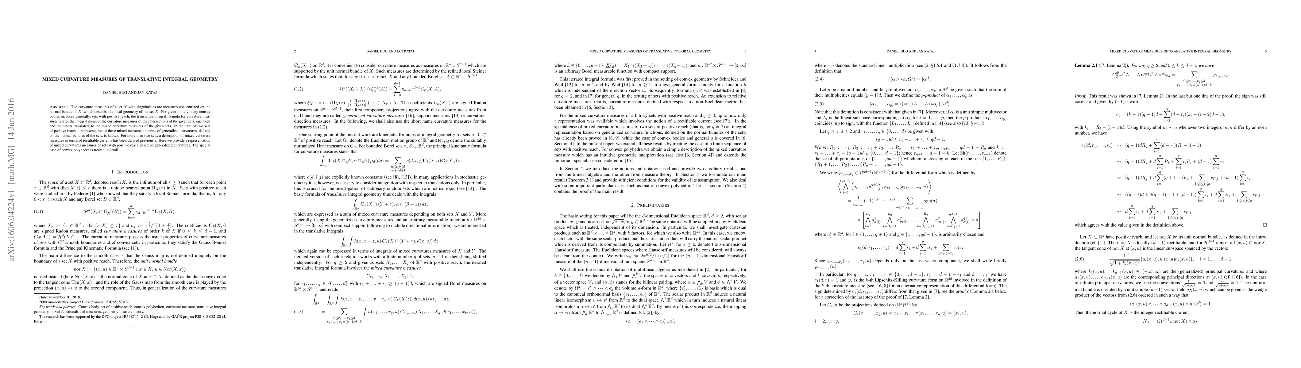 The curvature measures of a set $X$ with singularities are measures concentrated on the normal bundle of $X$, which describe the local geometry of the set $X$. For given finitely many convex bodies or, more generally, sets with positive reach, the translative integral formula for curvature measures relates the integral mean of the curvature measures of the intersections of the given sets, one fixed and the others translated, to the mixed curvature measures of the given sets. In the case of two sets of positive reach, a representation of these mixed measures in terms of generalized curvatures, defined on the normal bundles of the sets, is known. For more than two sets, a description of mixed curvature measures in terms of rectifiable currents has been derived previously. Here we provide a representation of mixed curvatures measures of sets with positive reach based on generalized curvatures. The special case of convex polyhedra is treated in detail.