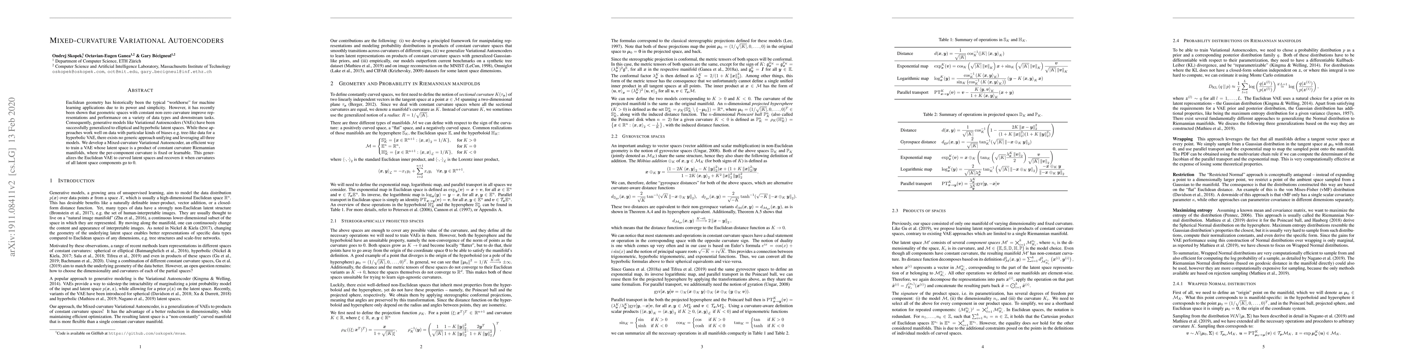 Euclidean geometry has historically been the typical "workhorse" for machine learning applications due to its power and simplicity. However, it has recently been shown that geometric spaces with constant non-zero curvature improve representations and performance on a variety of data types and downstream tasks. Consequently, generative models like Variational Autoencoders (VAEs) have been successfully generalized to elliptical and hyperbolic latent spaces. While these approaches work well on data with particular kinds of biases e.g. tree-like data for a hyperbolic VAE, there exists no generic approach unifying and leveraging all three models. We develop a Mixed-curvature Variational Autoencoder, an efficient way to train a VAE whose latent space is a product of constant curvature Riemannian manifolds, where the per-component curvature is fixed or learnable. This generalizes the Euclidean VAE to curved latent spaces and recovers it when curvatures of all latent space components go to 0.