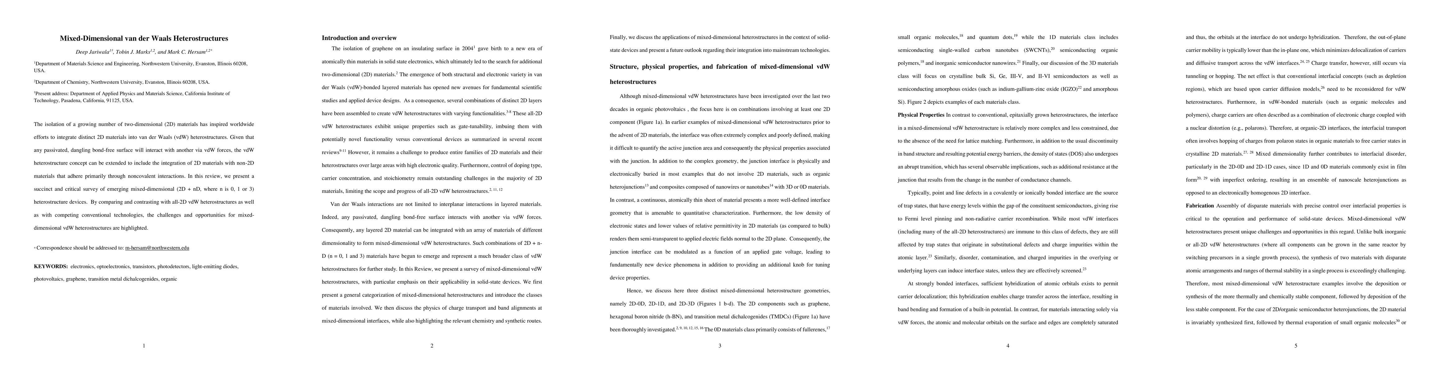 The isolation of a growing number of two-dimensional (2D) materials has inspired worldwide efforts to integrate distinct 2D materials into van der Waals (vdW) heterostructures. Given that any passivated, dangling bond-free surface will interact with another via vdW forces, the vdW heterostructure concept can be extended to include the integration of 2D materials with non-2D materials that adhere primarily through noncovalent interactions. In this review, we present a succinct and critical survey of emerging mixed-dimensional (2D + nD, where n is 0, 1 or 3) heterostructure devices. By comparing and contrasting with all-2D vdW heterostructures as well as with competing conventional technologies, the challenges and opportunities for mixed-dimensional vdW heterostructures are highlighted.