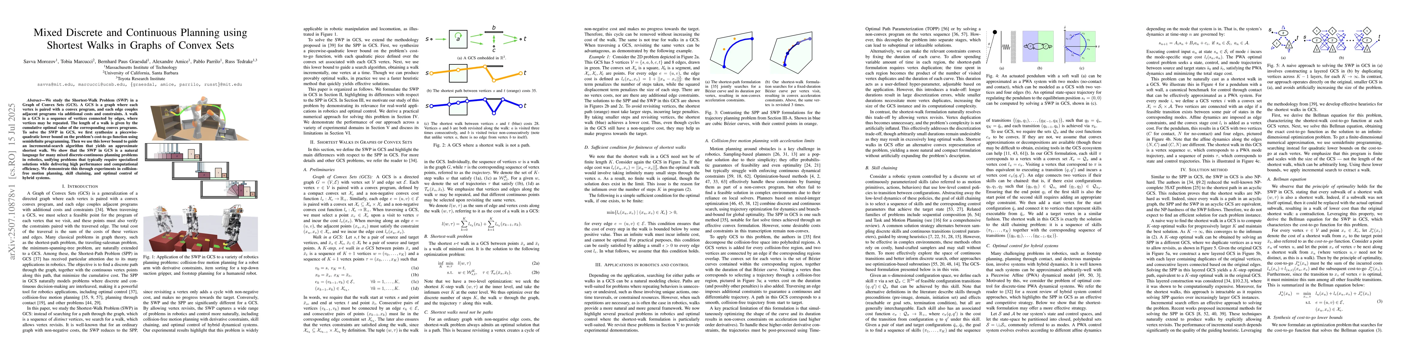 We study the Shortest-Walk Problem (SWP) in a Graph of Convex Sets (GCS). A GCS is a graph where each vertex is paired with a convex program, and each edge couples adjacent programs via additional costs and constraints. A walk in a GCS is a sequence of vertices connected by edges, where vertices may be repeated. The length of a walk is given by the cumulative optimal value of the corresponding convex programs. To solve the SWP in GCS, we first synthesize a piecewise-quadratic lower bound on the problem's cost-to-go function using semidefinite programming. Then we use this lower bound to guide an incremental-search algorithm that yields an approximate shortest walk. We show that the SWP in GCS is a natural language for many mixed discrete-continuous planning problems in robotics, unifying problems that typically require specialized solutions while delivering high performance and computational efficiency. We demonstrate this through experiments in collision-free motion planning, skill chaining, and optimal control of hybrid systems.