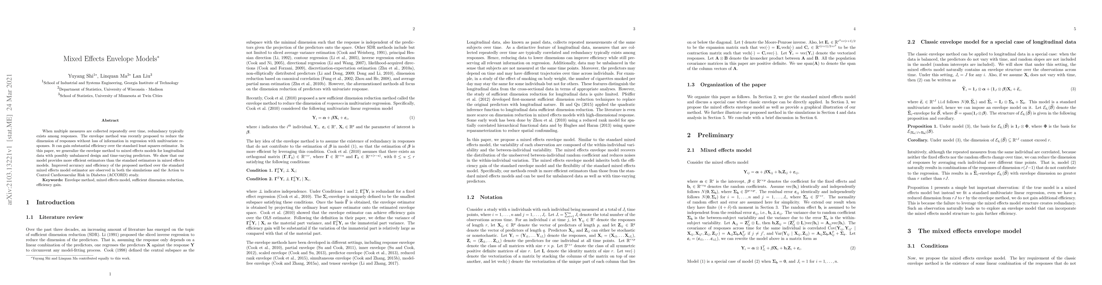 This paper generalizes the envelope method to mixed effects models for longitudinal data, demonstrating improved efficiency and accuracy compared to standard estimators in both simulations and the ACCORD study. The proposed method effectively reduces dimensionality without information loss, providing substantial gains over traditional least squares estimators.