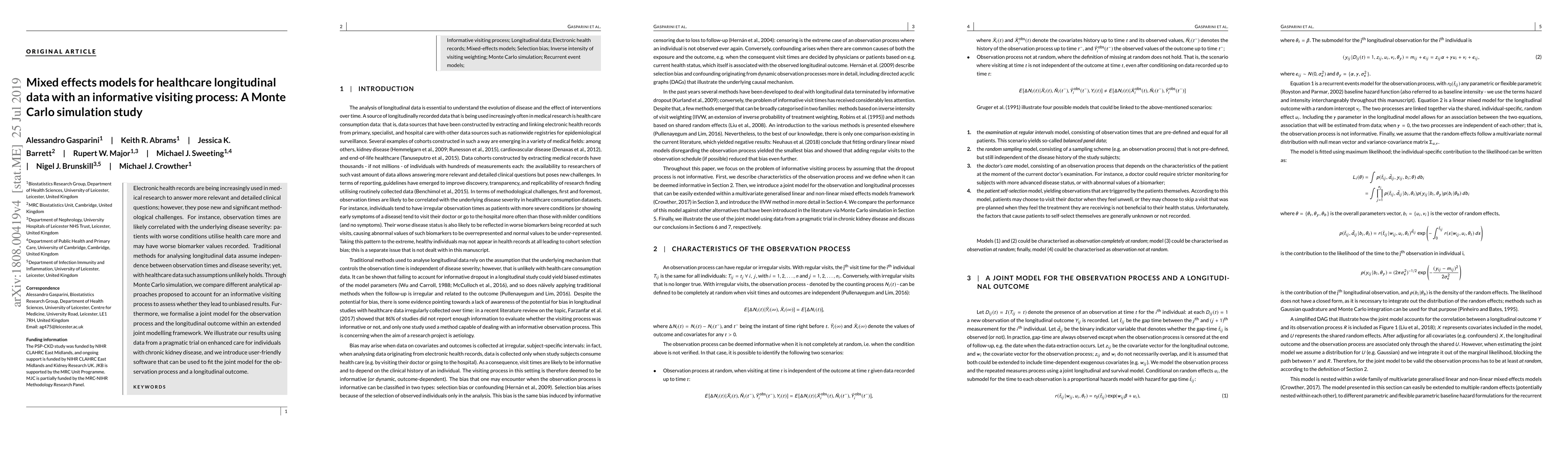 This paper evaluates mixed effects models for healthcare longitudinal data where observation times are correlated with disease severity, using Monte Carlo simulations. It proposes a joint model to address the informative visiting process and introduces software for fitting the model, illustrated with chronic kidney disease data.