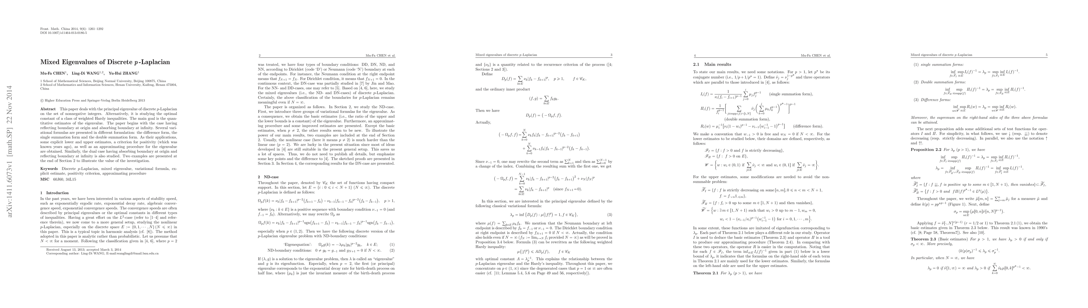 This paper deals with the principal eigenvalue of discrete $p$-Laplacian on the set of nonnegative integers. Alternatively, it is studying the optimal constant of a class of weighted Hardy inequalities. The main goal is the quantitative estimates of the eigenvalue. The paper begins with the case having reflecting boundary at origin and absorbing boundary at infinity. Several variational formulas are presented in different formulation: the difference form, the single summation form and the double summation form. As their applications, some explicit lower and upper estimates, a criterion for positivity (which was known years ago), as well as an approximating procedure for the eigenvalue are obtained. Similarly, the dual case having absorbing boundary at origin and reflecting boundary at infinity is also studied. Two examples are presented at the end of Section 2 to illustrate the value of the investigation.