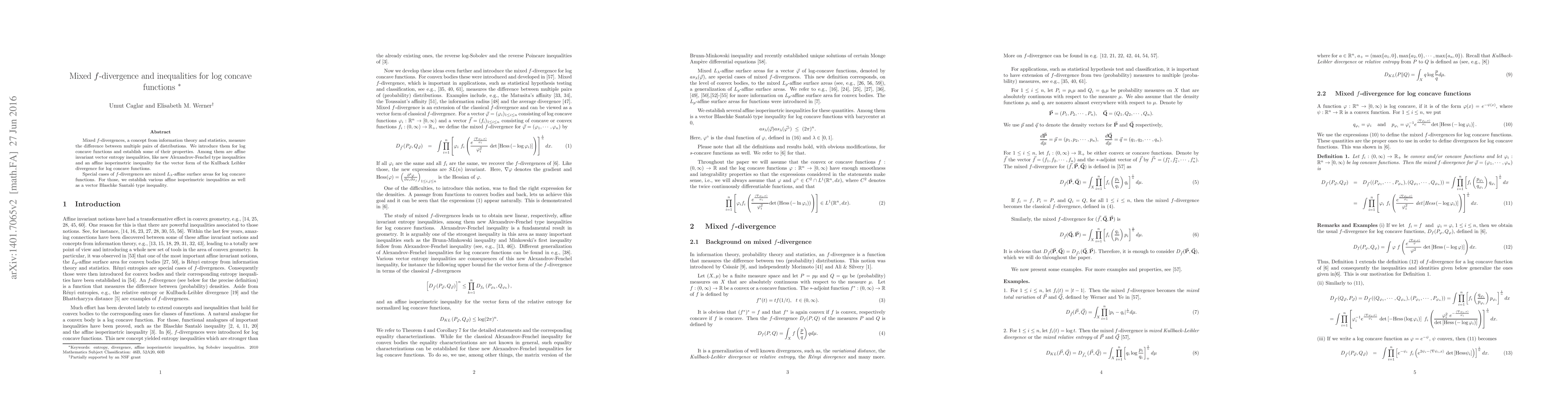 This paper introduces mixed $f$-divergences for log concave functions and explores their properties, including new inequalities like Alexandrov-Fenchel type and affine isoperimetric inequalities. It also establishes affine isoperimetric inequalities for mixed $L_\lambda$-affine surface areas and a vector Blaschke Santaló type inequality.