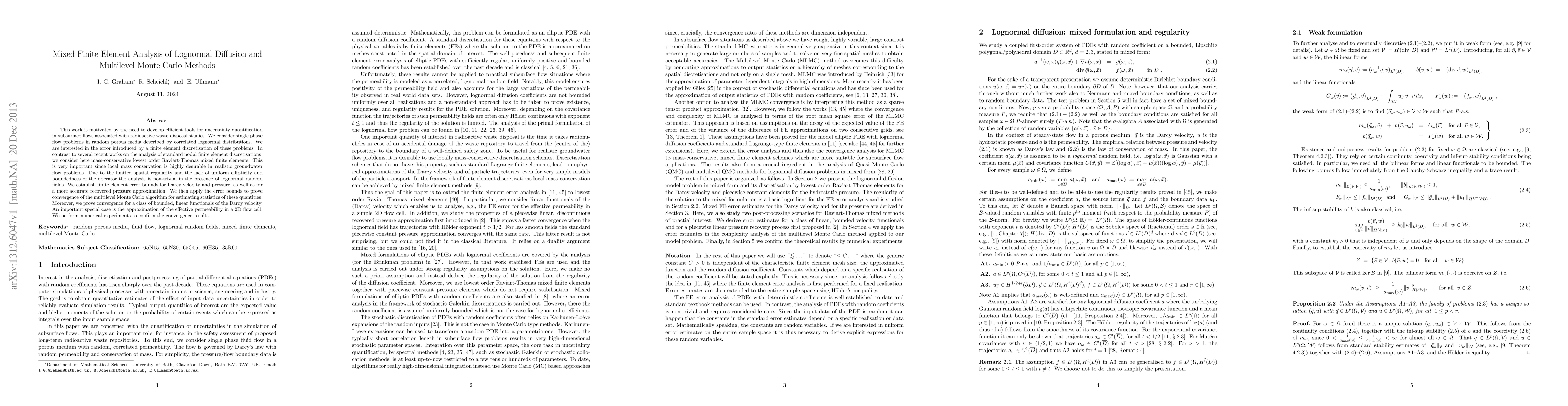This research develops efficient tools for uncertainty quantification in subsurface flows using mixed finite element methods and multilevel Monte Carlo techniques, focusing on mass conservation and establishing error bounds for Darcy velocity and pressure in lognormal diffusion problems. Numerical experiments validate the convergence of the proposed methods for estimating effective permeability.