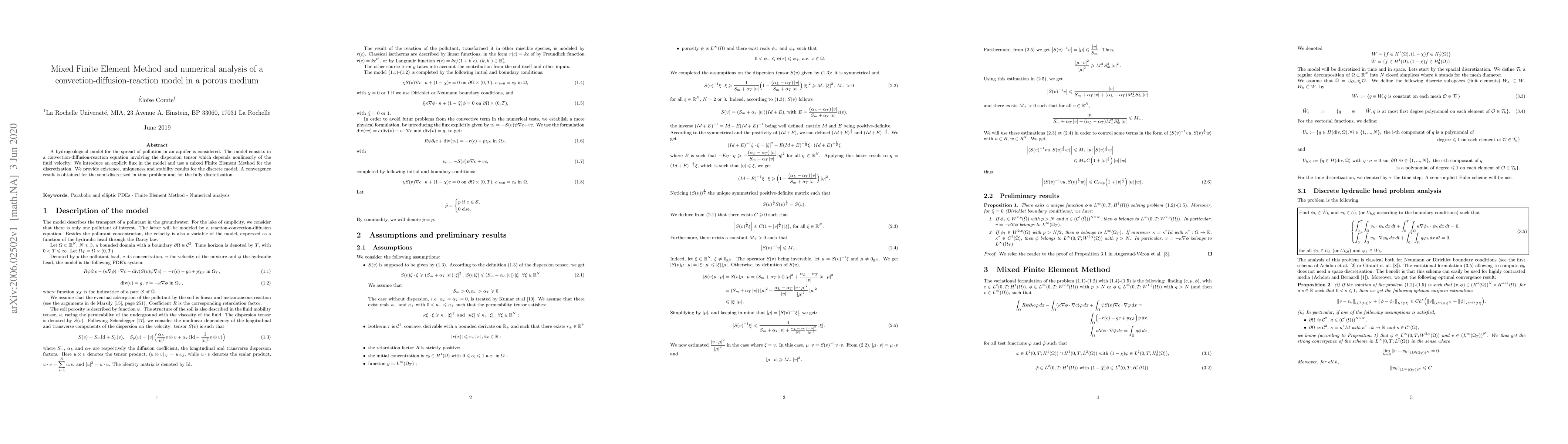 This paper develops a mixed Finite Element Method to numerically solve a convection-diffusion-reaction equation for pollution spread in an aquifer. It proves the existence, uniqueness, and stability of the discrete model, and provides convergence results for both semi-discretized and fully discretized versions.