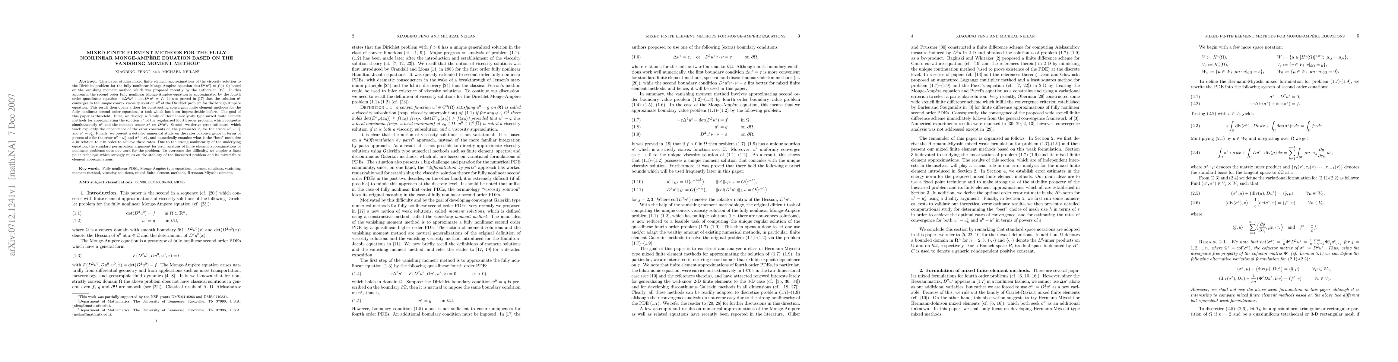 This paper develops mixed finite element methods for approximating solutions to the fully nonlinear Monge-Ampère equation using the vanishing moment method. It presents error estimates and conducts numerical studies to analyze convergence rates and optimal mesh sizes.