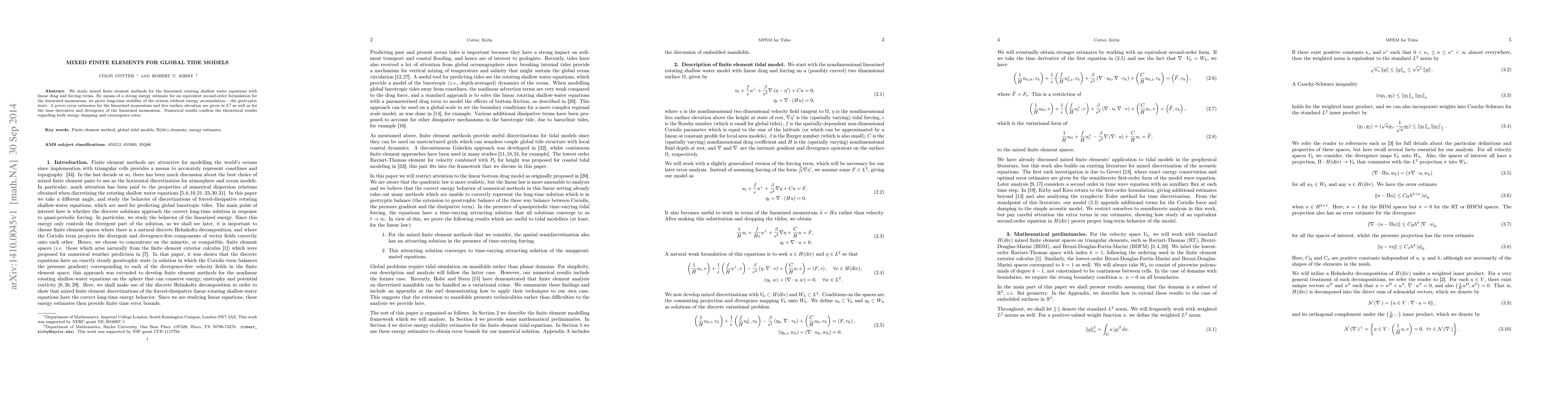 We study mixed finite element methods for the linearized rotating shallow water equations with linear drag and forcing terms. By means of a strong energy estimate for an equivalent second-order formulation for the linearized momentum, we prove long-time stability of the system without energy accumulation -- the geotryptic state. A priori error estimates for the linearized momentum and free surface elevation are given in $L^2$ as well as for the time derivative and divergence of the linearized momentum. Numerical results confirm the theoretical results regarding both energy damping and convergence rates.