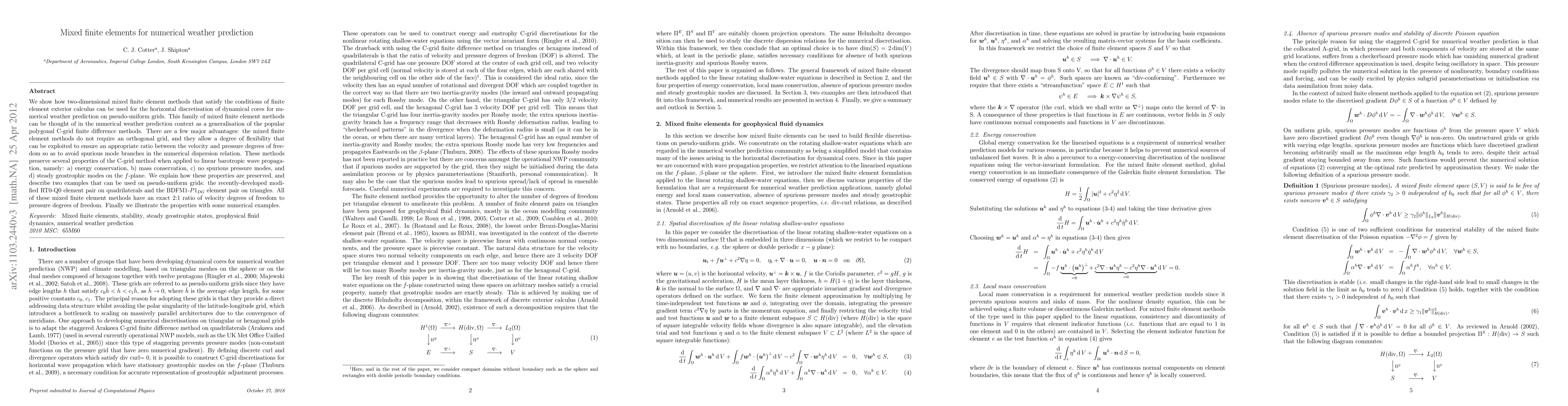 This paper explores the application of mixed finite element methods for numerical weather prediction, presenting a generalization of polygonal C-grid finite difference methods that do not require orthogonal grids. The methods preserve key properties like energy and mass conservation, and avoid spurious pressure modes, illustrated through examples like the modified RT0-Q0 and BDFM1-\pdg elements.
