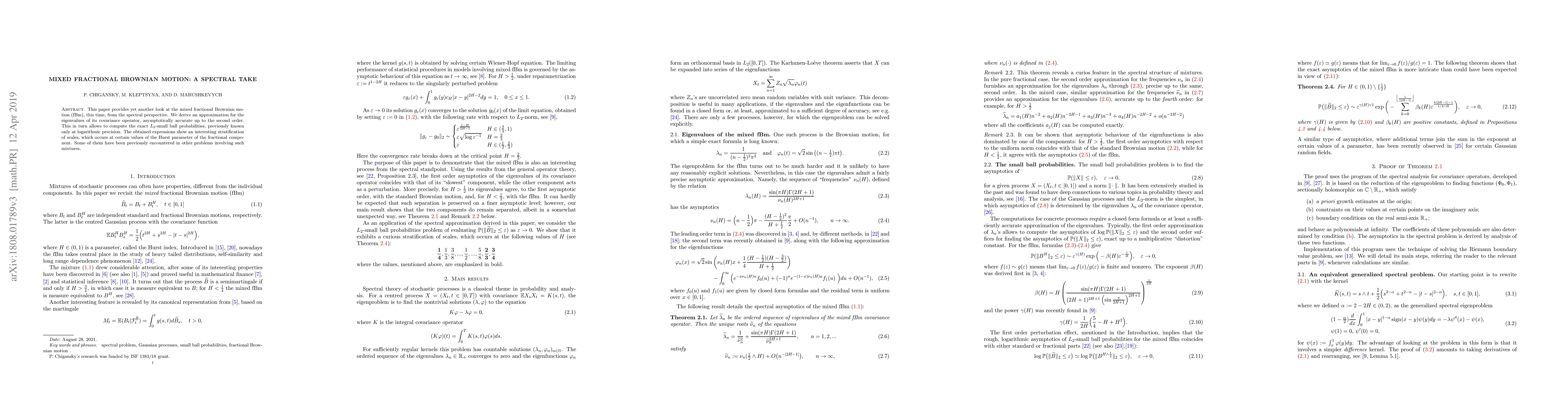 Researchers derived an approximation for eigenvalues of mixed fractional Brownian motion's covariance operator, enabling precise calculation of small ball probabilities with improved accuracy. This work reveals interesting scale stratification at specific Hurst parameter values.