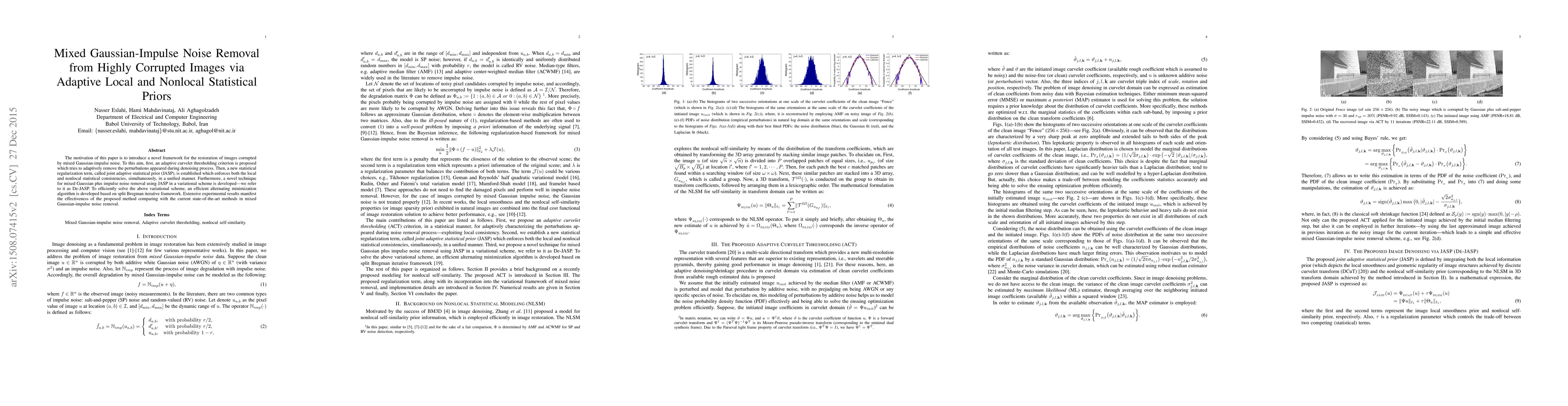 This paper proposes a novel framework for removing mixed Gaussian-impulse noise from highly corrupted images using adaptive local and nonlocal statistical priors. The method employs an adaptive curvelet thresholding criterion and a joint adaptive statistical prior (JASP) to enforce both local and nonlocal statistical consistencies, achieving effective noise removal through an efficient alternating minimization algorithm.