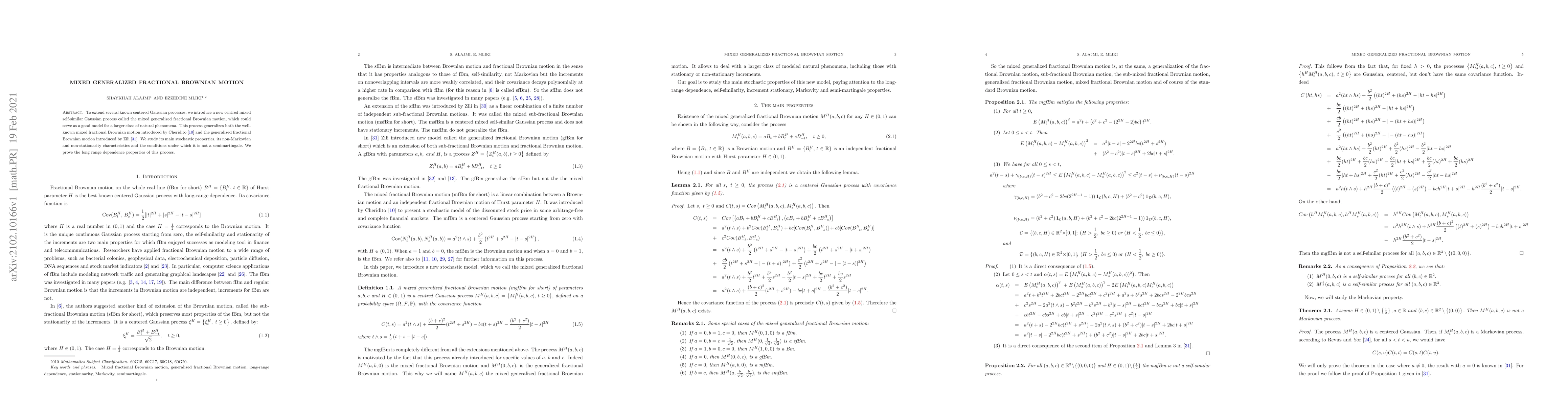 To extend several known centered Gaussian processes, we introduce a new centered mixed self-similar Gaussian process called the mixed generalized fractional Brownian motion, which could serve as a good model for a larger class of natural phenomena. This process generalizes both the well known mixed fractional Brownian motion introduced by Cheridito [10] and the generalized fractional Brownian motion introduced by Zili [31]. We study its main stochastic properties, its non-Markovian and non-stationarity characteristics and the conditions under which it is not a semimartingale. We prove the long range dependence properties of this process.