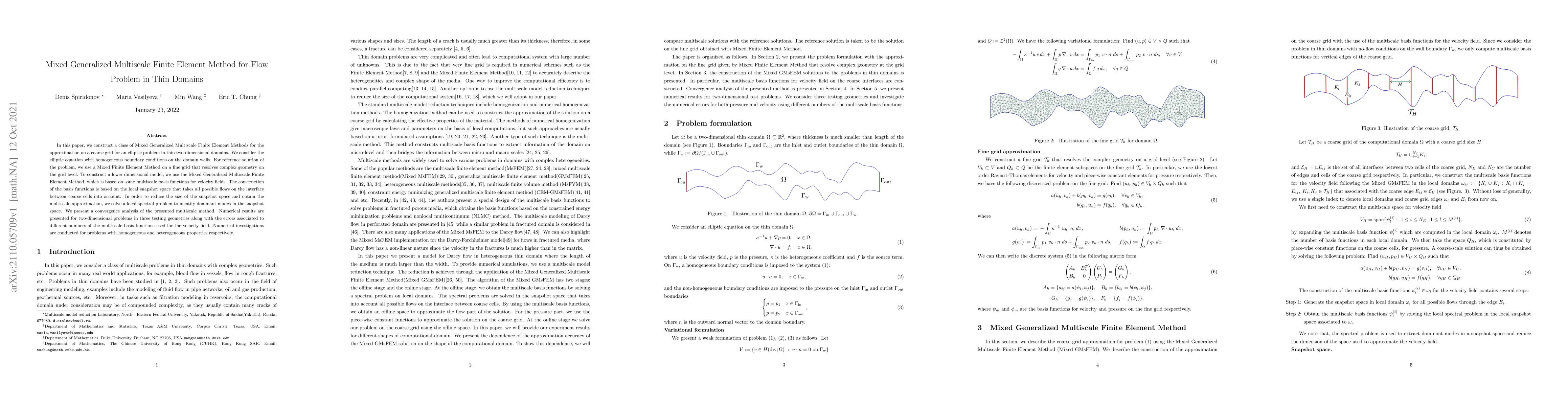 This paper develops a Mixed Generalized Multiscale Finite Element Method for solving elliptic flow problems in thin domains, using multiscale basis functions derived from local snapshots and spectral analysis to construct a coarse grid approximation. The method's convergence is analyzed, and numerical results demonstrate its effectiveness across different geometries and material properties.