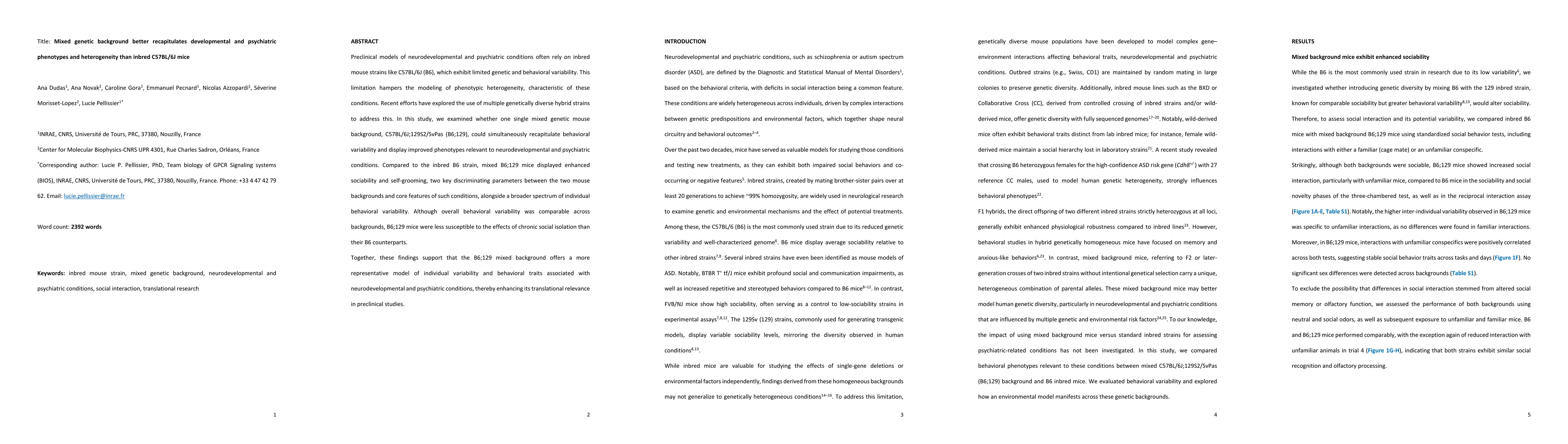Preclinical models of neurodevelopmental and psychiatric conditions often rely on inbred mouse strains like C57BL/6J (B6), which exhibit limited genetic and behavioral variability. This limitation hampers the modeling of phenotypic heterogeneity, characteristic of these conditions. Recent efforts have explored the use of multiple genetically diverse hybrid strains to address this. In this study, we examined whether one single mixed genetic mouse background, C57BL/6J;129S2/SvPas (B6;129), could simultaneously recapitulate behavioral variability and display improved phenotypes relevant to neurodevelopmental and psychiatric conditions. Compared to the inbred B6 strain, mixed B6;129 mice displayed enhanced sociability and self-grooming, two key discriminating parameters between the two mouse backgrounds and core features of such conditions, alongside a broader spectrum of individual behavioral variability. Although overall behavioral variability was comparable across backgrounds, B6;129 mice were less susceptible to the effects of chronic social isolation than their B6 counterparts. Together, these findings support that the B6;129 mixed background offers a more representative model of individual variability and behavioral traits associated with neurodevelopmental and psychiatric conditions, thereby enhancing its translational relevance in preclinical studies.