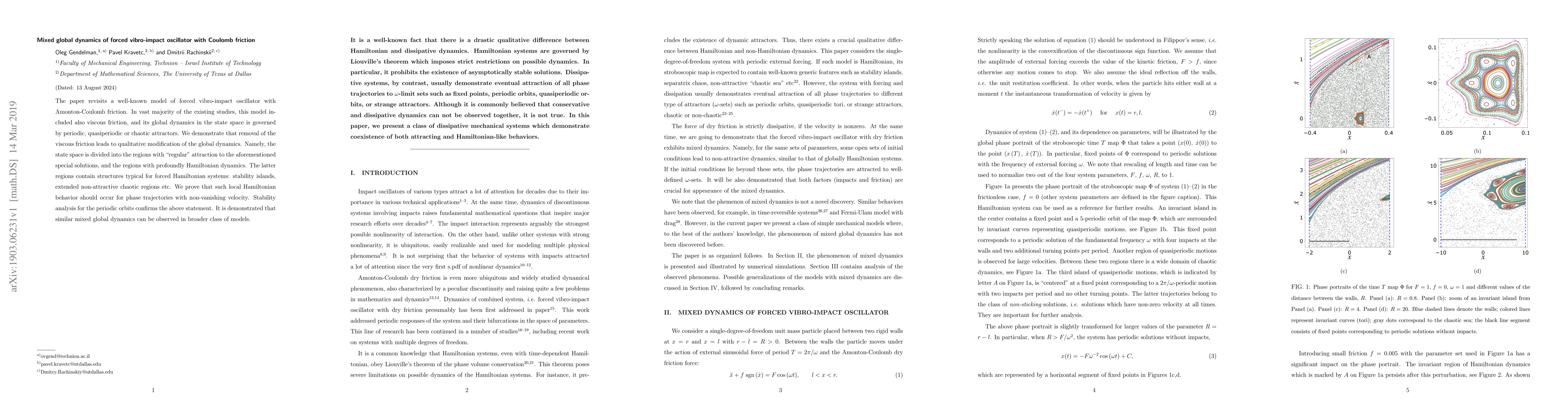 The paper revisits a well-known model of forced vibro-impact oscillator with Amonton-Coulomb friction. In vast majority of the existing studies, this model included also viscous friction, and its global dynamics in the state space is governed by periodic, quasiperiodic or chaotic attractors. We demonstrate that removal of the viscous friction leads to qualitative modification of the global dynamics. Namely, the state space is divided into the regions with "regular" attraction to the aforementioned special solutions, and the regions with profoundly Hamiltonian dynamics. The latter regions contain structures typical for forced Hamiltonian systems: stability islands, extended non-attractive chaotic regions etc. We prove that such local Hamiltonian behavior should occur for phase trajectories with non-vanishing velocity. Stability analysis for the periodic orbits confirms the above statement. It is demonstrated that similar mixed global dynamics can be observed in broader class of models.