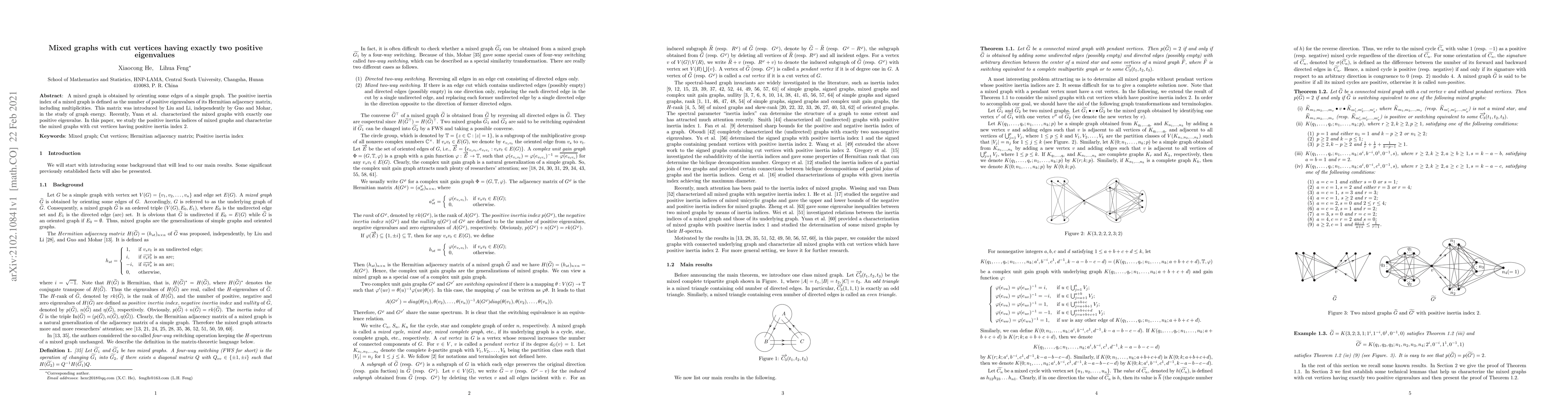 This paper investigates mixed graphs with cut vertices that possess exactly two positive eigenvalues in their Hermitian adjacency matrix, building on previous work characterizing graphs with a single positive eigenvalue. The study aims to identify structural properties of such graphs.