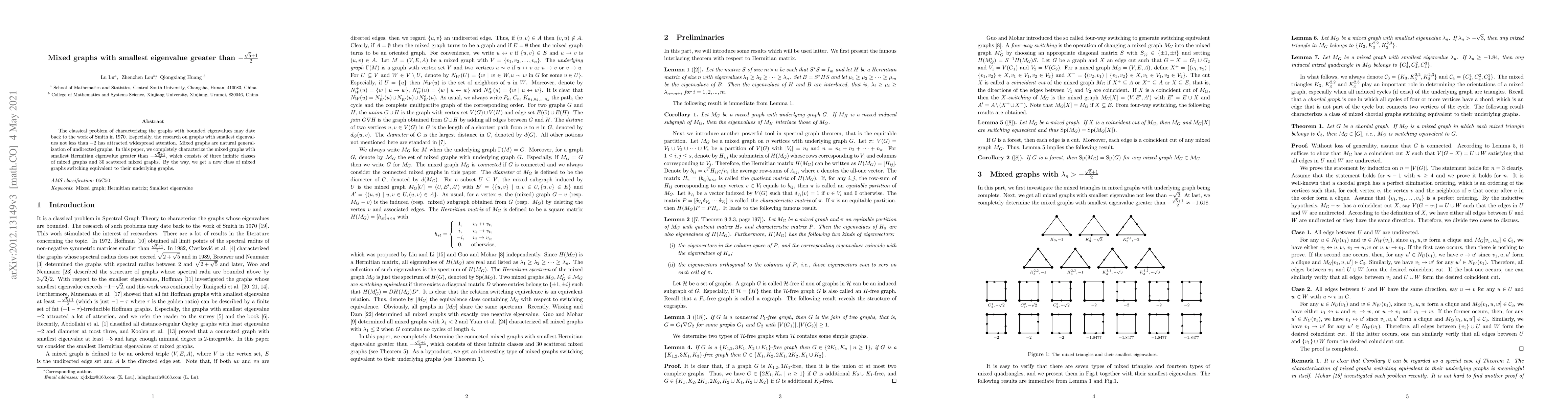 This paper characterizes mixed graphs with the smallest Hermitian eigenvalue greater than $-\frac{\sqrt{5}+1}{2}$, identifying three infinite classes and 30 scattered examples, and introduces a new class of mixed graphs that are switching equivalent to their underlying graphs.
