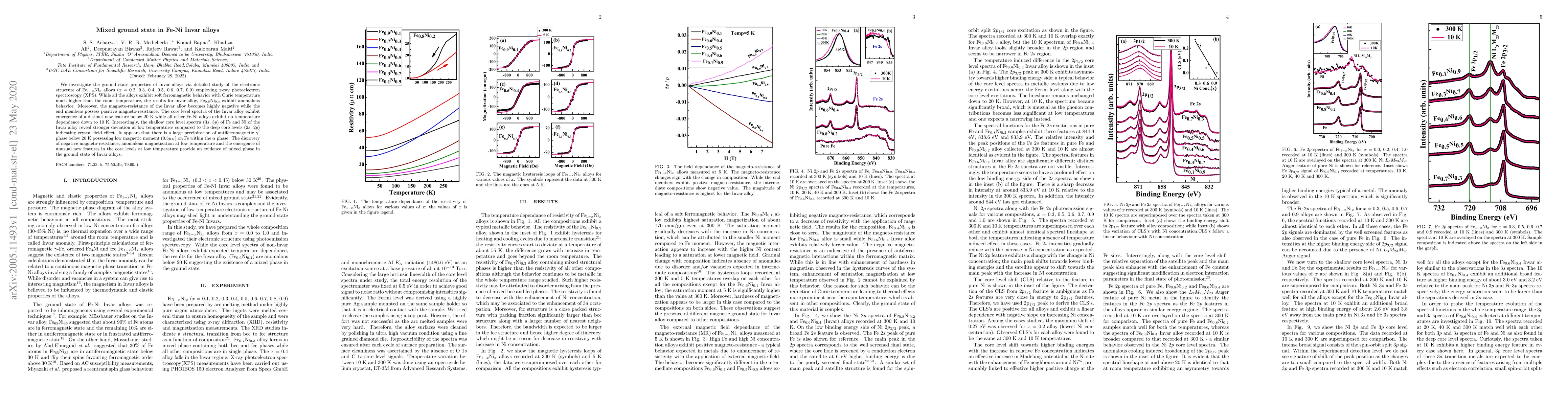 We investigate the ground state properties of Invar alloys via detailed study of the electronic structure of Fe$_{1-x}$Ni$_x$ alloys ($x$ = 0.2, 0.3, 0.4, 0.5, 0.6, 0.7, 0.9) employing $x$-ray photoelectron spectroscopy (XPS). While all the alloys exhibit soft ferromagnetic behavior with Curie temperature much higher than the room temperature, the results for invar alloy, Fe$_{0.6}$Ni$_{0.4}$ exhibit anomalous behavior. Moreover, the magneto-resistance of the Invar alloy becomes highly negative while the end members possess positive magneto-resistance. The core level spectra of the Invar alloy exhibit emergence of a distinct new feature below 20~K while all other Fe-Ni alloys exhibit no temperature dependence down to 10~K. Interestingly, the shallow core level spectra (3$s$, 3$p$) of Fe and Ni of the Invar alloy reveal stronger deviation at low temperatures compared to the deep core levels (2$s$, 2$p$) indicating crystal field effect. It appears that there is a large precipitation of antiferromagnetic $\gamma^\prime$ phase below 20 K possessing low magnetic moment (0.5$\mu_B$) on Fe within the $\alpha$ phase. The discovery of negative magneto-resistance, anomalous magnetization at low temperature and the emergence of unusual new features in the core levels at low temperature provide an evidence of mixed phase in the ground state of Invar alloys.