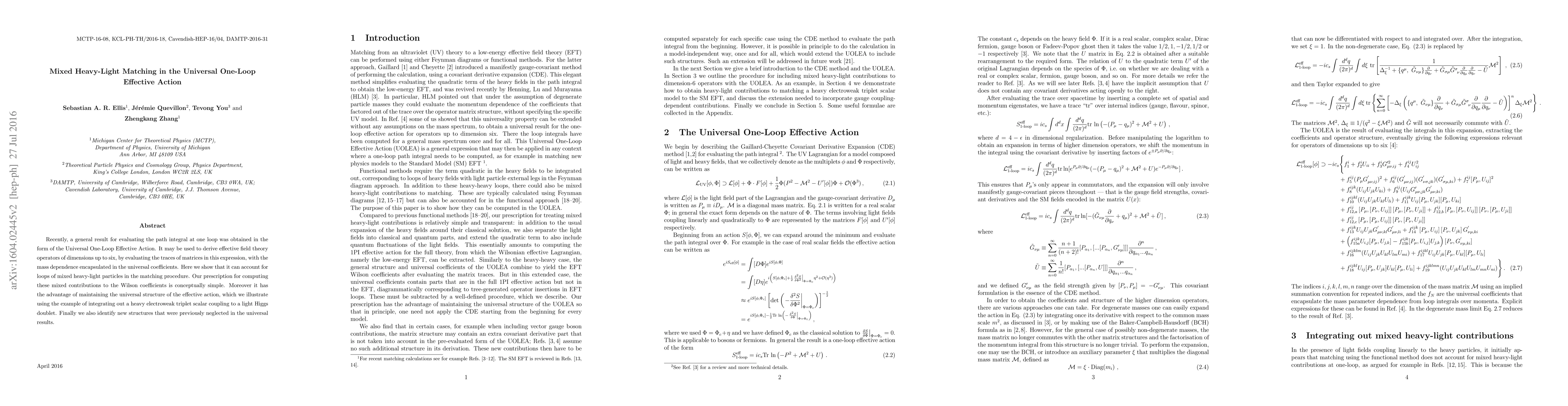 Recently, a general result for evaluating the path integral at one loop was obtained in the form of the Universal One-Loop Effective Action. It may be used to derive effective field theory operators of dimensions up to six, by evaluating the traces of matrices in this expression, with the mass-dependence encapsulated in the universal coefficients. Here we show that it can account for loops of mixed heavy-light particles in the matching procedure. Our prescription for computing these mixed contributions to the Wilson coefficients is conceptually simple. Moreover it has the advantage of maintaining the universal structure of the effective action, which we illustrate using the example of integrating out a heavy electroweak triplet scalar coupling to a light Higgs doublet. Finally we also identify new structures that were previously neglected in the universal results.