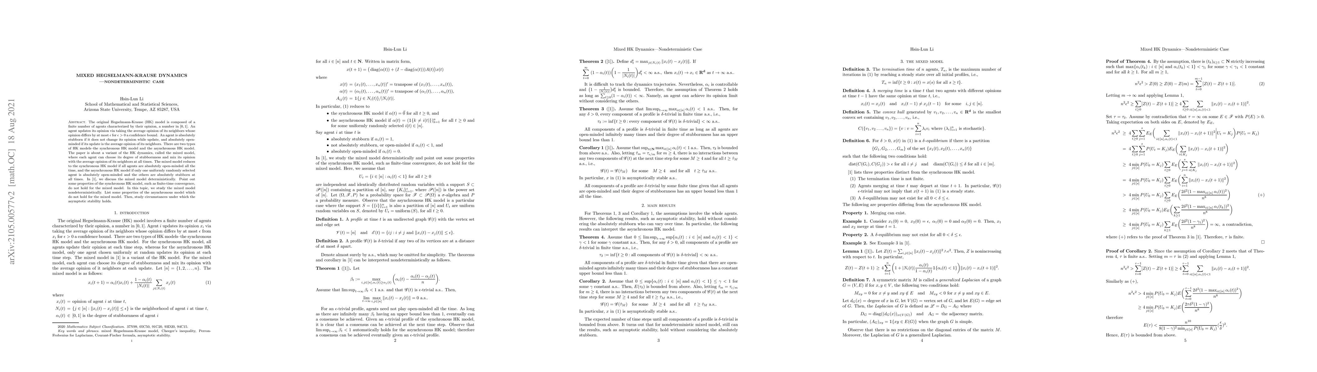 The original Hegselmann-Krause (HK) model is composed of a finite number of agents characterized by their opinion, a number in $[0,1]$. An agent updates its opinion via taking the average opinion of its neighbors whose opinion differs by at most $\epsilon$ for $\epsilon>0$ a confidence bound. An agent is absolutely stubborn if it does not change its opinion while update, and absolutely open-minded if its update is the average opinion of its neighbors. There are two types of HK models--the synchronous HK model and the asynchronous HK model. The paper is about a variant of the HK dynamics, called the mixed model, where each agent can choose its degree of stubbornness and mix its opinion with the average opinion of its neighbors at all times. The mixed model reduces to the synchronous HK model if all agents are absolutely open-minded all the time, and the asynchronous HK model if only one uniformly randomly selected agent is absolutely open-minded and the others are absolutely stubborn at all times. In \cite{mhk}, we discuss the mixed model deterministically. Point out some properties of the synchronous HK model, such as finite-time convergence, do not hold for the mixed model. In this topic, we study the mixed model nondeterministically. List some properties of the asynchronous model which do not hold for the mixed model. Then, study circumstances under which the asymptotic stability holds.