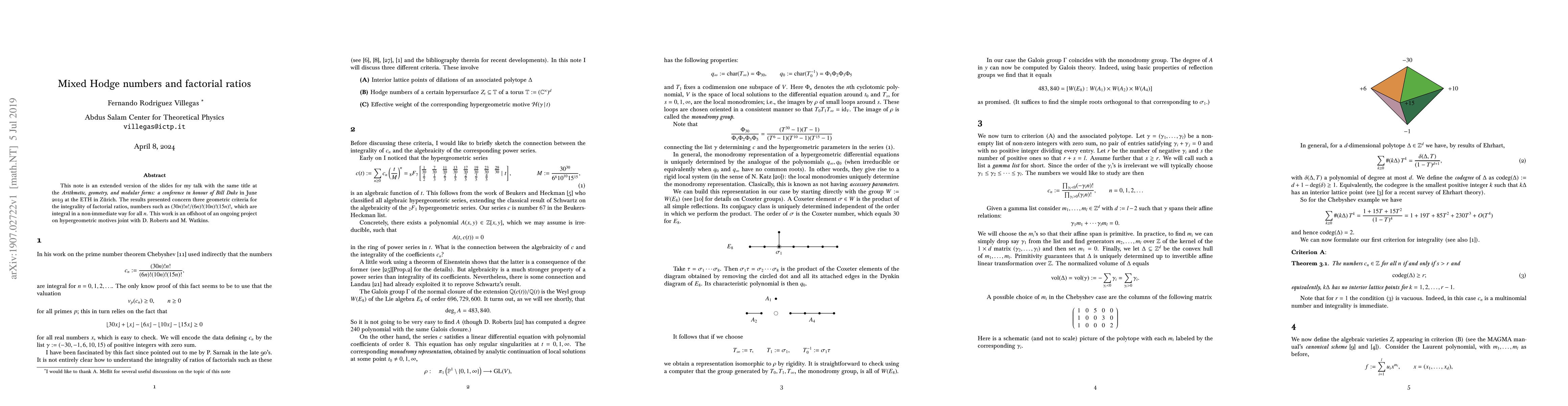 This note is an extended version of the slides for my talk with the same title at the {\it Arithmetic, geometry, and modular forms: a conference in honour of Bill Duke} in June 2019 at the ETH in Z"urich. The results presented concern three geometric criteria for the integrality of factorial ratios, numbers such as (30n)!n!/(6n)!(10n)!(15n)!, which are integral in a non-immediate way for all n. This work is an offshoot of an ongoing project on hypergeometric motives joint with D. Roberts and M. Watkins.