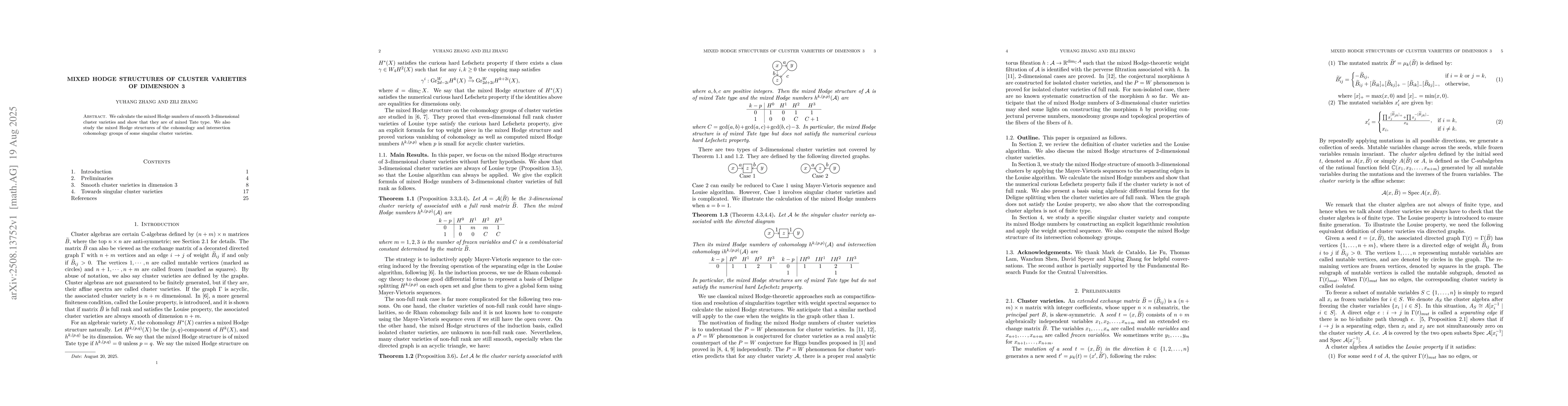 The research calculates mixed Hodge numbers of smooth 3-dimensional cluster varieties, demonstrating they are of mixed Tate type. It also examines mixed Hodge structures of cohomology and intersection cohomology groups of singular cluster varieties using Mayer-Vietoris argument, compactifications, and resolutions of singularities.