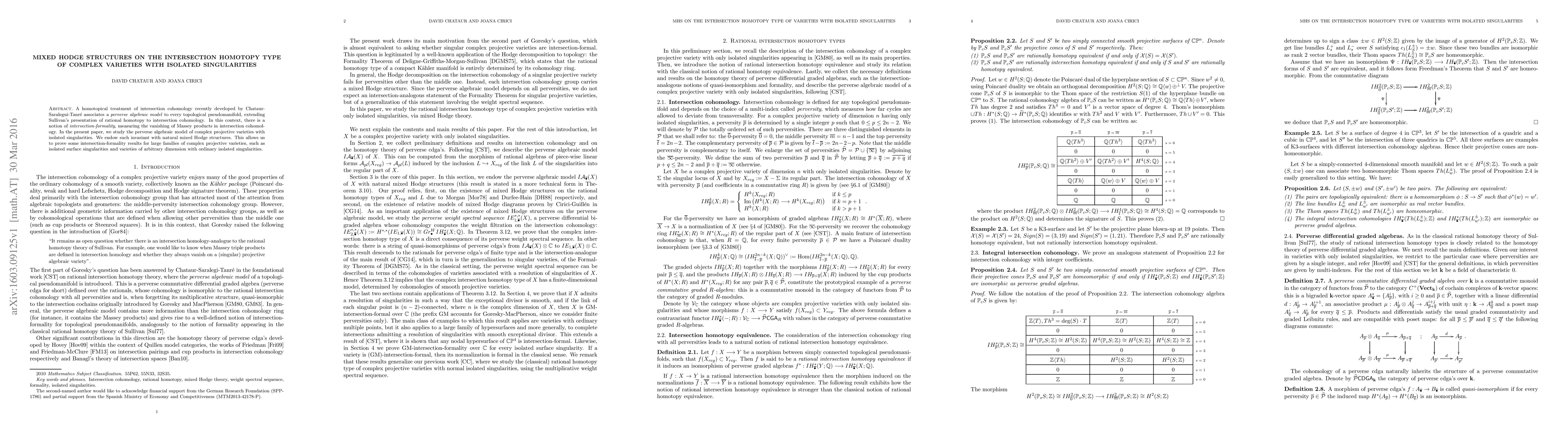 A homotopical treatment of intersection cohomology recently developed by Chataur-Saralegui-Tanr\'e associates a "perverse algebraic model" to every topological pseudomanifold, extending Sullivan's presentation of rational homotopy to intersection cohomology. In this context, there is a notion of "intersection-formality", measuring the vanishing of Massey products in intersection cohomology. In the present paper, we study the perverse algebraic model of complex projective varieties with isolated singularities. We endow such invariant with natural mixed Hodge structures. This allows us to prove some intersection-formality results for large families of complex projective varieties, such as isolated surface singularities and varieties of arbitrary dimension with ordinary isolated singularities.