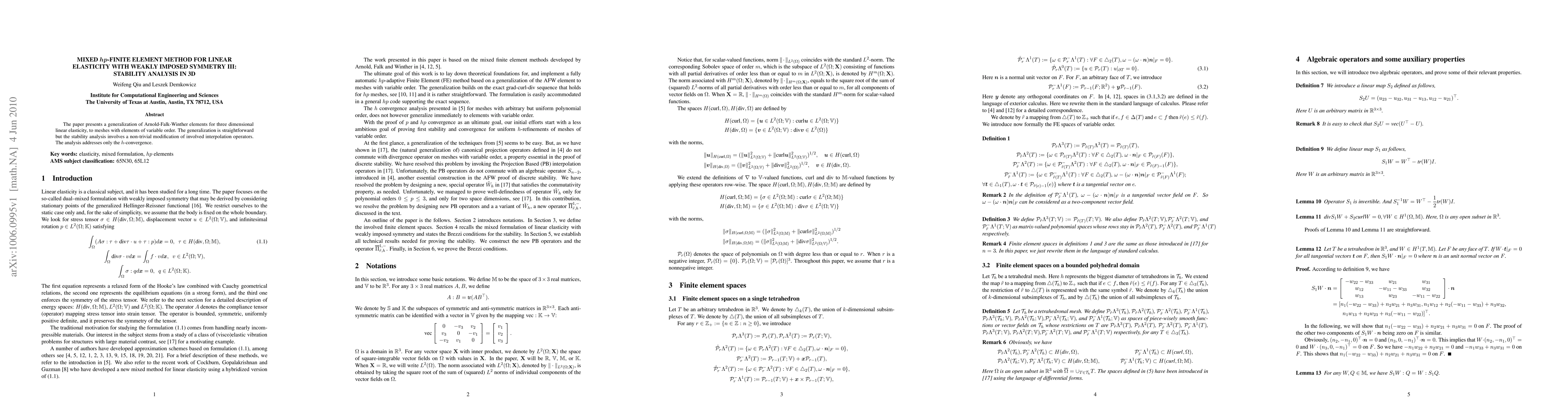 This paper introduces a mixed hp-finite element method for 3D linear elasticity with variable-order elements, focusing on h-convergence stability analysis.