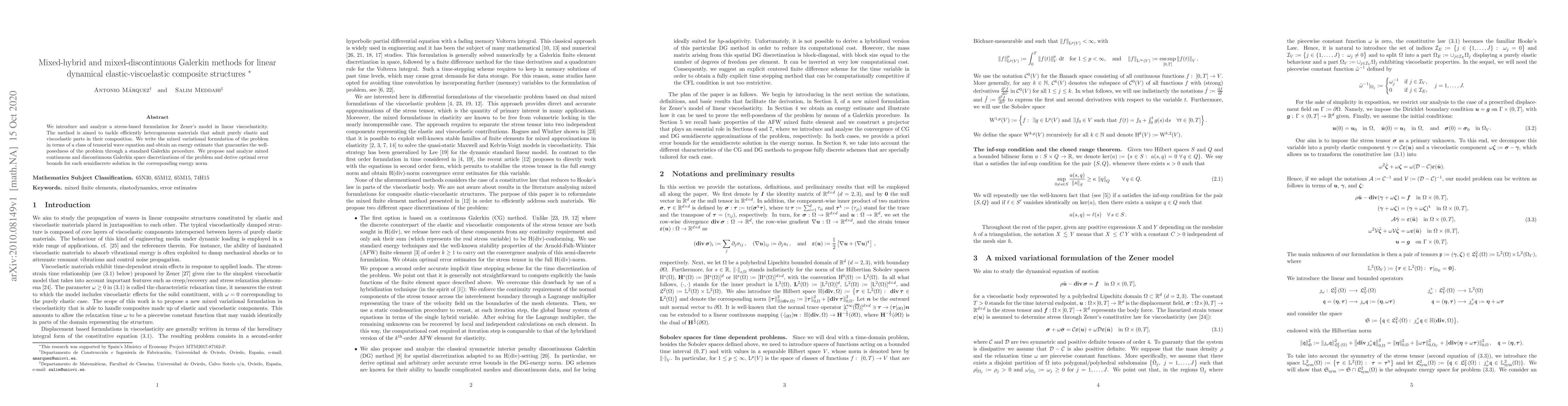 This paper introduces mixed-hybrid and mixed-discontinuous Galerkin methods for analyzing linear dynamical elastic-viscoelastic composite structures, focusing on Zener's model in linear viscoelasticity. It provides an energy estimate ensuring well-posedness and derives optimal error bounds for semidiscrete solutions.