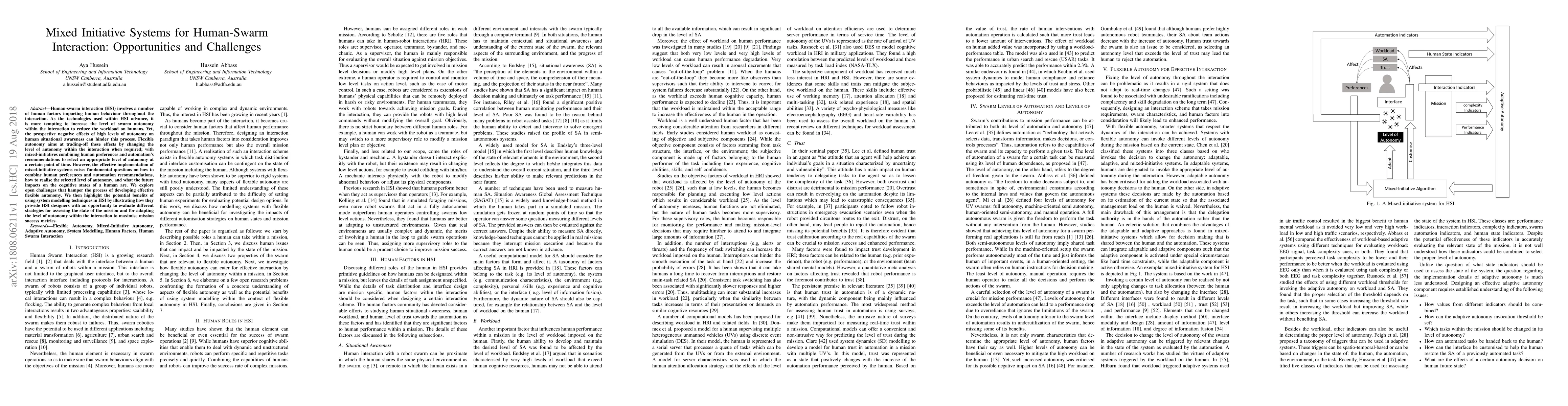 This paper examines the opportunities and challenges of mixed initiative systems in human-swarm interaction (HSI), focusing on the balance between human control and swarm autonomy. It highlights the difficulties in effectively integrating human preferences with automation recommendations and discusses the potential benefits of system modelling techniques to optimize mission success.