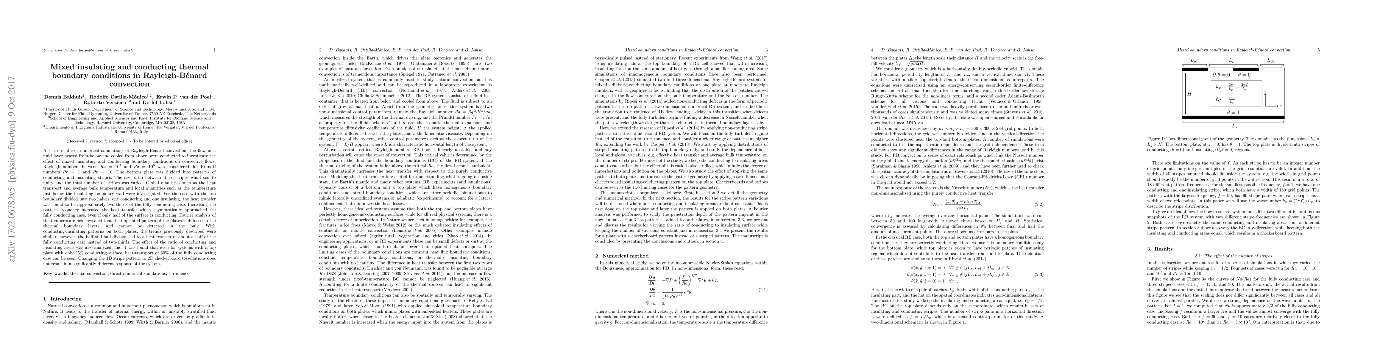 A series of direct numerical simulations of Rayleigh-B\'enard convection, the flow in a fluid layer heated from below and cooled from above, were conducted to investigate the effect of mixed insulating and conducting boundary conditions on convective flows. Rayleigh numbers between $\text{Ra}=10^7$ and $\text{Ra}=10^9$ were considered, for Prandtl numbers $\text{Pr}=1$ and $\text{Pr}=10$. The bottom plate was divided into patterns of conducting and insulating stripes. The size ratio between these stripes was fixed to unity and the total number of stripes was varied. Global quantities such as the heat transport and average bulk temperature and local quantities such as the temperature just below the insulating boundary wall were investigated. For the case with the top boundary divided into two halves, one conducting and one insulating, the heat transfer was found to be approximately two thirds of the fully conducting case. Increasing the pattern frequency increased the heat transfer which asymptotically approached the fully conducting case, even if only half of the surface is conducting. Fourier analysis of the temperature field revealed that the imprinted pattern of the plates is diffused in the thermal boundary layers, and cannot be detected in the bulk. With conducting-insulating patterns on both plates, the trends previously described were similar, however, the half-and-half division led to a heat transfer of about a half of the fully conducting case instead of two-thirds. The effect of the ratio of conducting and insulating areas was also analyzed, and it was found that even for systems with a top plate with only $25\%$ conducting surface, heat-transport of $60\%$ of the fully conducting case can be seen. Changing the 1D stripe pattern to 2D checkerboard tessellations does not result in a significantly different response of the system.