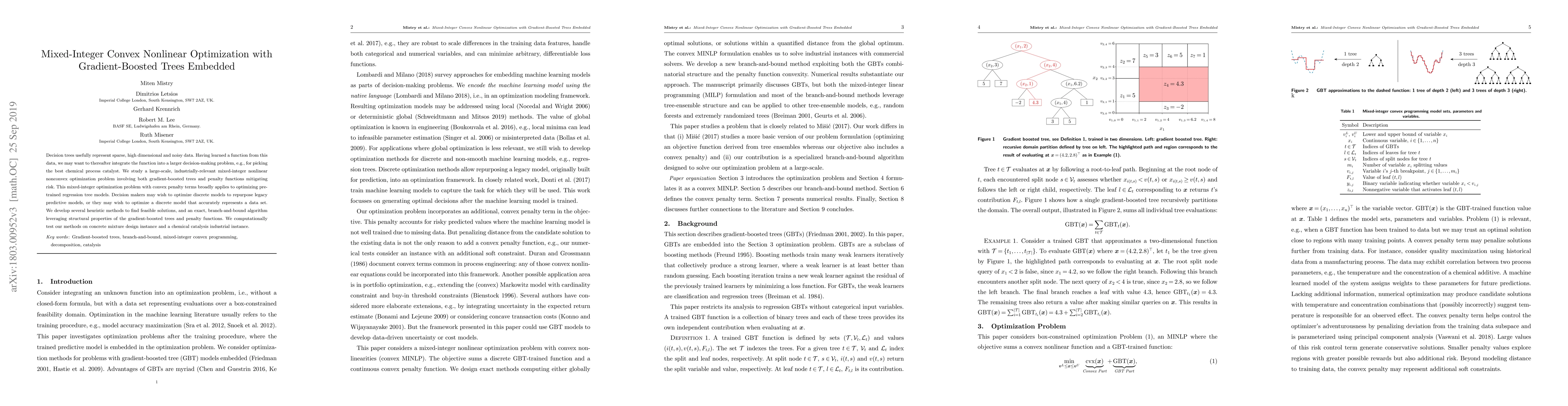 This paper explores mixed-integer convex nonlinear optimization incorporating gradient-boosted trees for optimizing pre-trained regression models. It develops heuristic and exact algorithms to solve large-scale industrial optimization problems, testing them on mixture design and chemical catalysis instances.