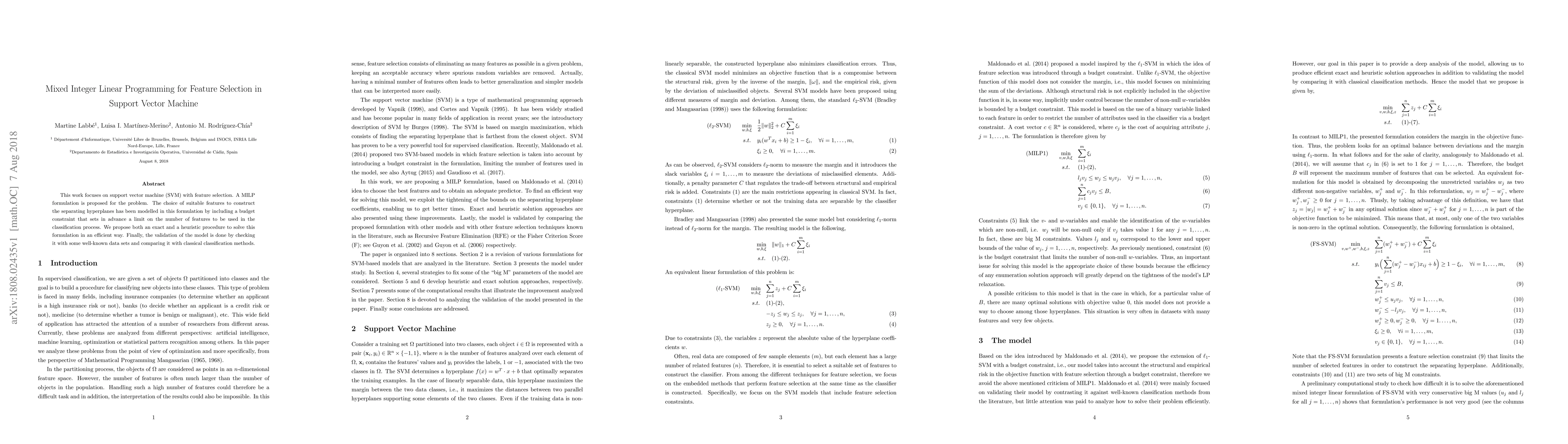 This work focuses on support vector machine (SVM) with feature selection. A MILP formulation is proposed for the problem. The choice of suitable features to construct the separating hyperplanes has been modelled in this formulation by including a budget constraint that sets in advance a limit on the number of features to be used in the classification process. We propose both an exact and a heuristic procedure to solve this formulation in an efficient way. Finally, the validation of the model is done by checking it with some well-known data sets and comparing it with classical classification methods.