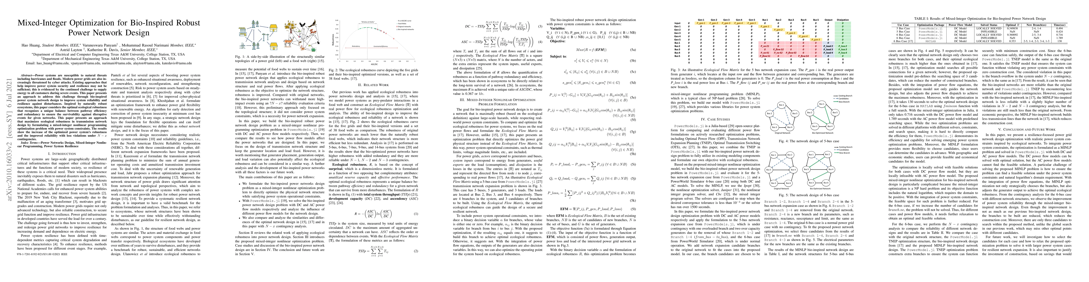 This paper proposes a mixed-integer optimization method for designing robust power networks inspired by natural ecosystems, aiming to enhance resilience against natural disasters and cyber attacks. The approach formulates a nonlinear programming problem to balance efficiency and redundancy, resulting in improved system reliability and reduced violations under severe disruptions.
