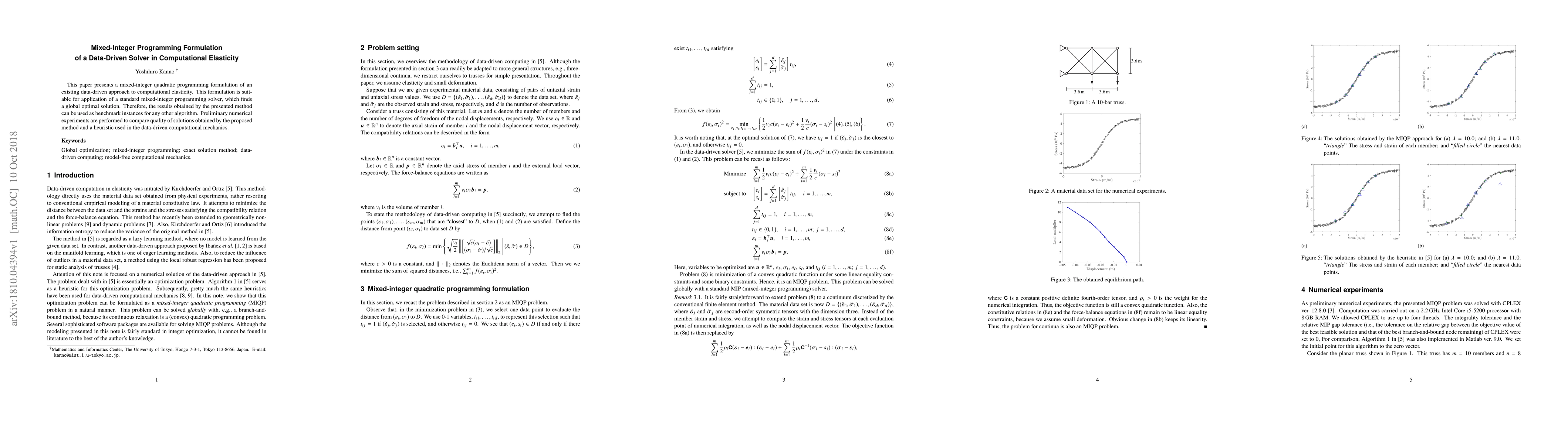 This paper introduces a mixed-integer quadratic programming formulation for a data-driven solver in computational elasticity, enabling global optimal solutions via standard solvers. Preliminary experiments show the proposed method's superior solution quality compared to existing heuristics.