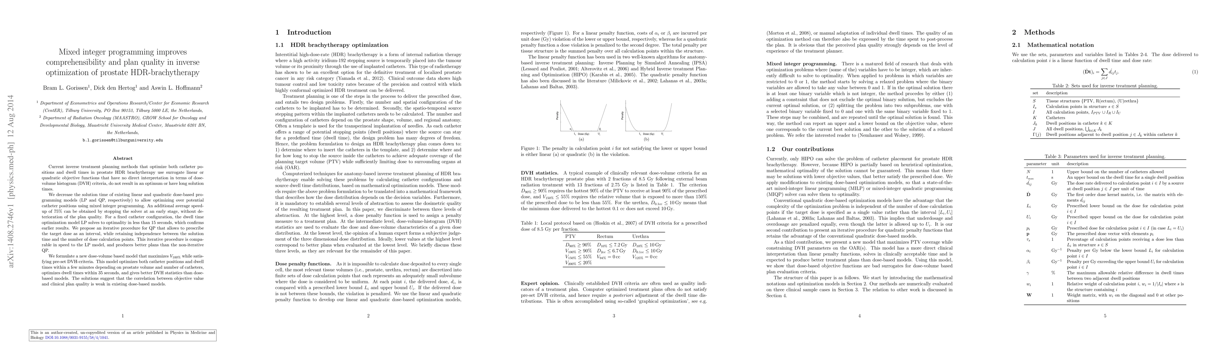 Current inverse treatment planning methods that optimize both catheter positions and dwell times in prostate HDR brachytherapy use surrogate linear or quadratic objective functions that have no direct interpretation in terms of dose-volume histogram (DVH) criteria, do not result in an optimum or have long solution times. We decrease the solution time of existing linear and quadratic dose-based programming models (LP and QP, respectively) to allow optimizing over potential catheter positions using mixed integer programming. An additional average speed-up of 75% can be obtained by stopping the solver at an early stage, without deterioration of the plan quality. For a fixed catheter configuration, the dwell time optimization model LP solves to optimality in less than 15 seconds, which confirms earlier results. We propose an iterative procedure for QP that allows to prescribe the target dose as an interval, while retaining independence between the solution time and the number of dose calculation points. This iterative procedure is comparable in speed to the LP model, and produces better plans than the non-iterative QP. We formulate a new dose-volume based model that maximizes $V_{100\%}$ while satisfying pre-set DVH-criteria. This model optimizes both catheter positions and dwell times within a few minutes depending on prostate volume and number of catheters, optimizes dwell times within 35 seconds, and gives better DVH statistics than dose-based models. The solutions suggest that the correlation between objective value and clinical plan quality is weak in existing dose-based models.