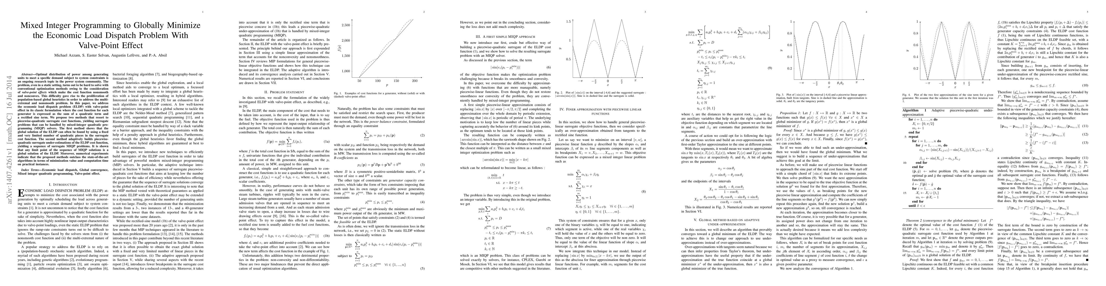 This paper proposes mixed-integer programming methods to solve the economic load dispatch problem (ELDP) with valve-point effect, using piecewise-quadratic surrogate cost functions. The methods outperform existing algorithms, achieving better minimization values and computation times.