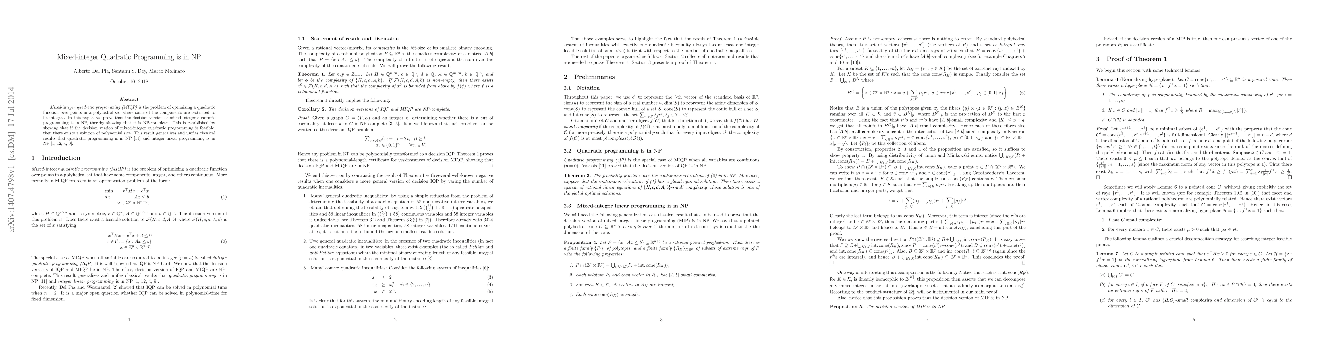 The paper proves that the decision version of mixed-integer quadratic programming (MIQP) is in NP, demonstrating its NP-completeness by showing a polynomial-size solution exists if feasible. This unifies classical results for quadratic programming and integer linear programming.