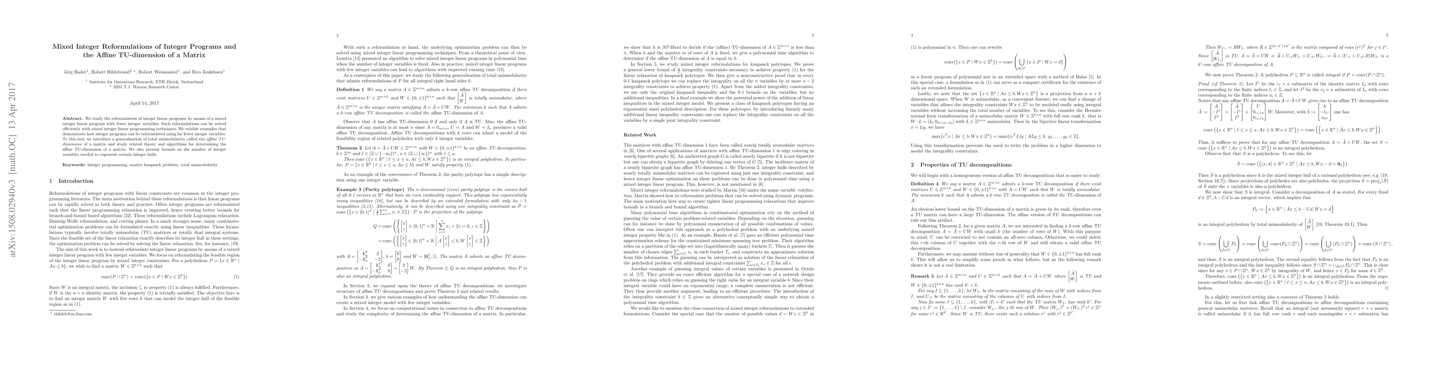 We study the reformulation of integer linear programs by means of a mixed integer linear program with fewer integer variables. Such reformulations can be solved efficiently with mixed integer linear programming techniques. We exhibit examples that demonstrate how integer programs can be reformulated using far fewer integer variables. To this end, we introduce a generalization of total unimodularity called the \emph{affine TU-dimension} of a matrix and study related theory and algorithms for determining the affine TU-dimension of a matrix. We also present bounds on the number of integer variables needed to represent certain integer hulls.