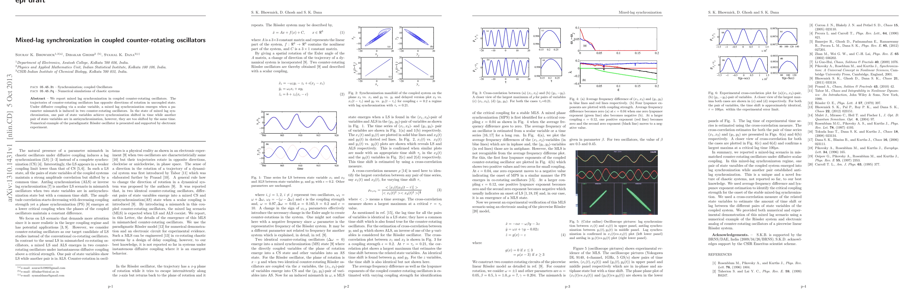 This paper investigates mixed lag synchronization in coupled counter-rotating oscillators, where under diffusive coupling and parameter mismatch, one pair of variables synchronizes with a time lag while another pair antisynchronizes with the same lag shift. This phenomenon is demonstrated using the Rössler oscillator and validated through both numerical simulations and electronic experiments.