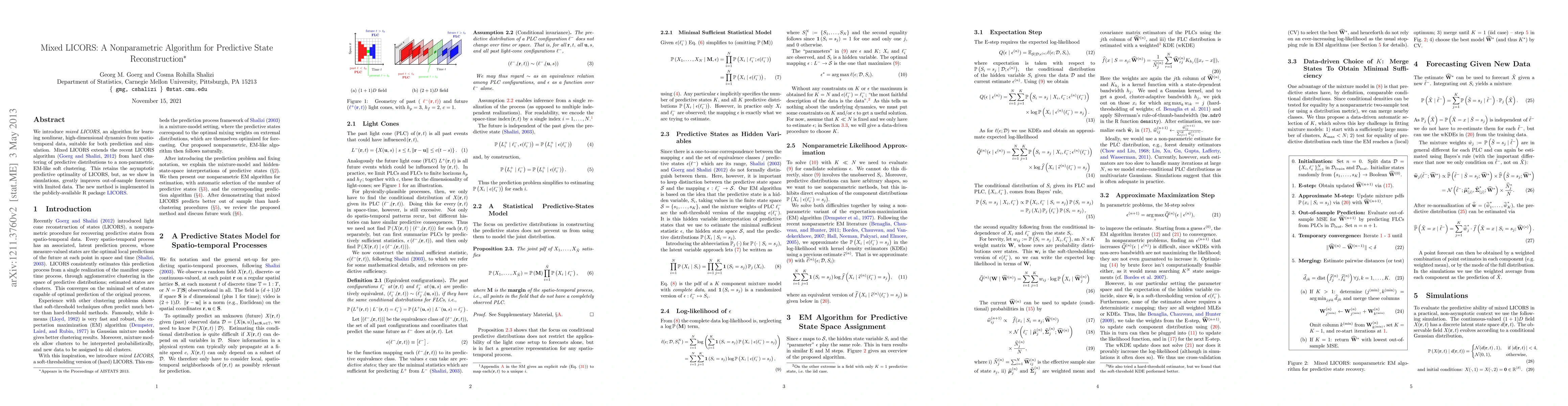 "Mixed LICORS" is a nonparametric algorithm that enhances predictive state reconstruction for nonlinear, high-dimensional dynamics by employing a soft clustering method, improving out-of-sample forecasts, and is available in the R package "LICORS".